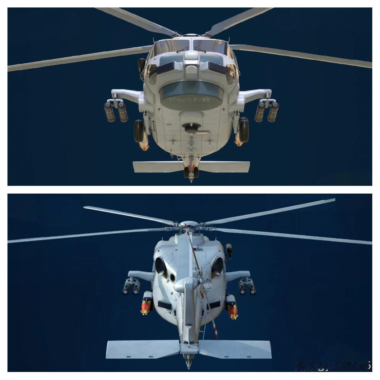 截止目前为止,海军版的直-20只有两种型号,一种直-20F,一种是直-20J。直-20J是运输突击型,主要配备两栖攻击舰。而直-20F是反潜型号,配备的范围和用途更为广泛,航母、两栖攻击舰和驱护舰都会配备。而两者外形还是有区别的,最好区分的就是直-20F机头下方装有大尺寸对海搜索雷达,具备多目标跟踪和逆合成孔径雷达成像能力,能有效探测水面航行舰艇和具有隐形设计的目标,还可为超视距反舰导弹提供中继制导 。这是直-20J所不具备的,也是直-20未来可能发展成为多用途直升机的基础。图中的这架直-20明显有圆盘型的大尺寸对海搜索雷达,至于挂架和直-20F有所不同,很可能是该机执行别的任务时对挂载的武器做了调整,但基本可以确定是直-20F无疑!图1、2、3是直-20J,图4、5、6则是直-20F。