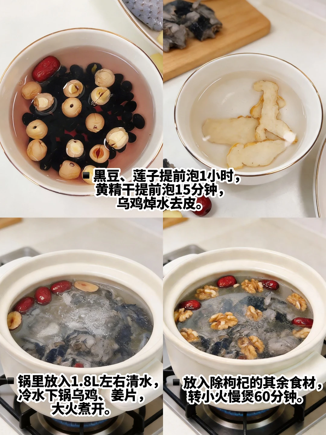 ▪️黑豆、莲子提前泡1小时,黄精干提前泡15分钟,乌鸡焯水去皮。