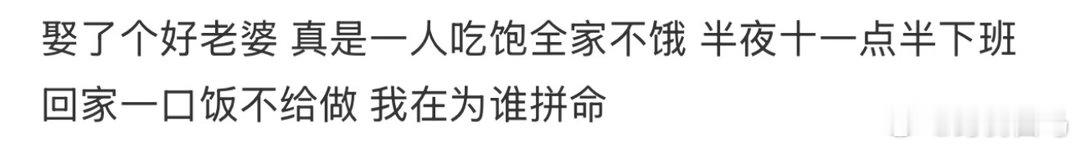 娶了个好老婆 真是一人吃饱全家不饿 半夜十一点半下班 回家一口饭不给做 我在为谁拼命