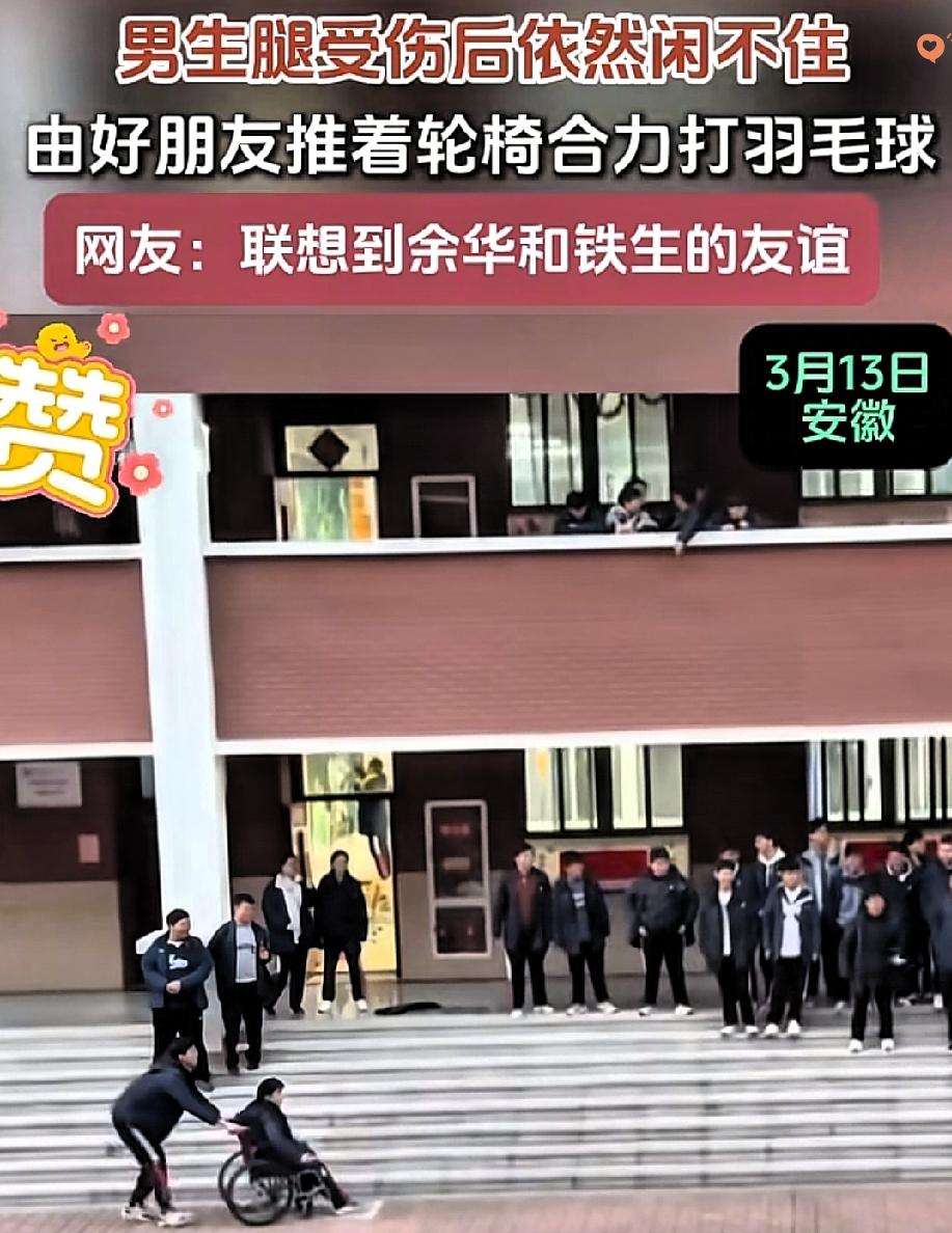 谁能拒绝这样的青春啊! 安徽校园里的一幕,直接被人民日报点赞,看完心里暖得发烫。 老师听见走廊满是喝彩,探头就见操场上的特殊组合——男生推着轮椅上的同学打羽毛球,一个挥拍进攻,一个紧盯球路调整方向,默契得像配合了千百遍。 没有小心翼翼的怜悯,也没有刻意标榜的帮助,推轮椅的少年只把对方当成想一起打球的朋友,坐轮椅的同学也笑得坦荡,眼里全是对运动的热爱。 这才是友谊最好的样子啊,不是单方面的施舍,而是平等的陪伴与成全。 就像当年余华推着史铁生踢球,真正的在乎,是让你不必困在“特殊”的标签里,尽情享受生活的乐趣。 青春里最珍贵的,从来不是完美的皮囊,而是这份纯粹又赤诚的善意。 你学生时代有过这样双向奔赴的友情吗?
