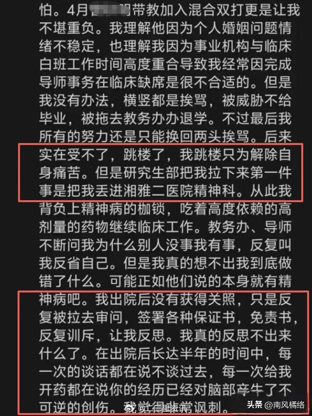 一条鲜活的生命,永远定格在2026年长沙的春日,定格在湘江的波光里,那是他熬完无数个夜班后,再也没能等到的下一个黎明。 2026年3月14号晚上9点57分,湘雅医院2023级研究生孙同学,离开宿舍后便与外界失去了联系,校方发现到异常后,第一时间就拨通了报警电话。 不到两小时,警方就在橘子洲大桥水域,发现了疑似坠江者的踪迹,经过了整夜的搜救工作,次日的下午4点左右,打捞上岸的身影已经没有了生命体征。 官方通报明确排除他杀可能,确认系高坠身亡,针对网传的导师压榨、强制劳动等这些的指控,由中南大学与省卫健委组成的联合调查组,已经全面启动核查工作。 网传孙同学早在2024年,就曾经因为跳楼未遂而接受治疗了,出院后,他仍需承担着繁重的临床工作,生前多次向亲友抱怨,导师安排的任务远超合理范畴。 他曾直言,只要听到导师的电话,就会心生恐惧,这种长期的精神压力,早就已经压得他喘不过气来,却始终找不到有效的倾诉和解决渠道。 规培制度下,医学生常面临着超长工作时长,动着连续值班数十小时,基本的劳动保障已经严重缺失,师生间权力的失衡,让不少学生敢怒不敢言。 像这样的悲剧并不是孤例,此前已经有很多地方曝出了医学生因不堪重负出现的心理危机,却始终没有得到行业和社会的足够重视。 孙同学的悲剧,不只是他一个人的不幸,而是规培制度积弊的集中爆发,师生权力的不对等,让学生在面对不合理的要求的时候,几乎没有反抗的余地。 超长工作的无保障、心理支持的缺位,这些问题就像一个无形的枷锁一样,牢牢的套在了每一个规培生身上,如果不彻底的打破这种失衡状态,难免会有更多的年轻生命为此付出代价。 事情的发生也反映出了公众对医疗人才培养的关切,大家期待的不仅是真相,更是能真正保护医学生权益的制度完善与落地。 有网友愤怒留言:“这导师压榨也太离谱了!学生都快被榨干了吧”,还有人呼吁必须严查规培中的灰色地带,不能让悲剧重演。 从孙同学失联到确认身亡,短短的48小时的悲剧,揪紧了无数人的心,网传的细节、官方的通报、舆论的热议,都指向同一个核心:医学生群体的生存困境已经到了不容忽视的地步,我们等待着调查组的最终结论,但更该思考的是,到底该怎么样为这些未来的医者撑起保护伞? 在我看来,每个选择学医的孩子,最初都怀揣着治病救人的热忱,可现实里的超长值班、无休任务、压抑的师生关系,却慢慢的磨掉了这份热忱,导师不该是学生的压榨者,规培也不该是摧残年轻人的牢笼,希望这一次悲剧能真正的推动制度改变,让每一个医学生都能在尊重和保障里面逐梦。