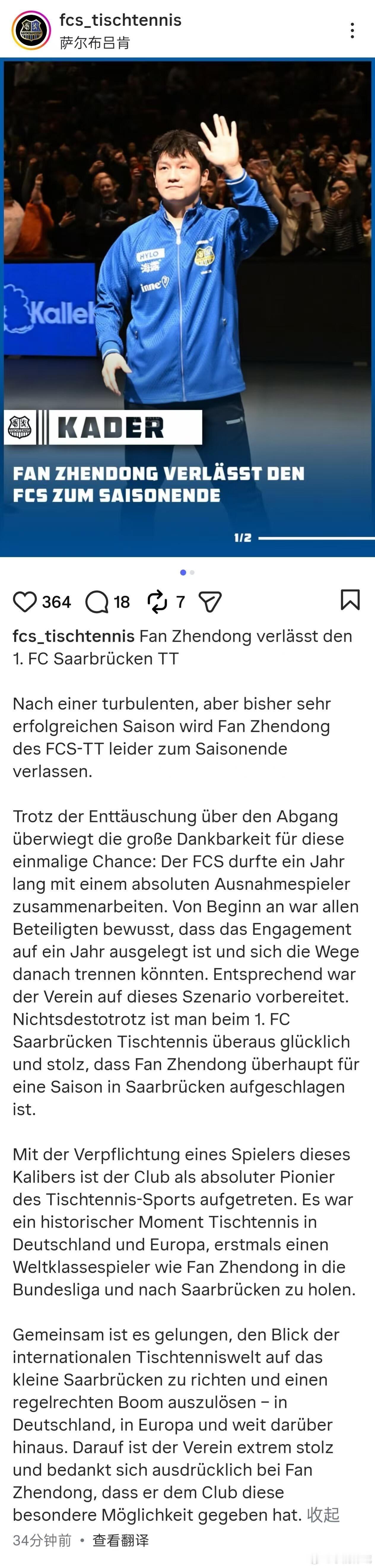 樊振东回应转会樊振东告别萨尔布吕肯👋“准备好迈出新步伐”3月16日,德国萨尔布吕肯乒乓球俱乐部官方社媒宣布,樊振东将在本赛季结束后离开球队。对此,樊振东表示:“我想向萨尔布吕肯乒乓球俱乐部表达我最诚挚的感谢,感谢他们给予我这次难以置信的机会。这是我职业生涯中一段非常特别的经历。不过在职业生涯的这个阶段,我也已经准备好迈出新的步伐。杜塞尔多夫俱乐部是欧洲乃至世界乒乓球最强大的力量之一,而我与波尔(Timo Boll)之间深厚的友谊也激励我去迎接新的挑战。”“明年以对手的身份与萨尔布吕肯交手一定会是一种很特别的感觉,我已经开始期待这些对决。不过我在这里的旅程还远没有结束。在赛季的最后一场比赛之前,我都会全力以赴,希望能够和球队一起在这个赛季创造历史。”(澎湃新闻·运动家)