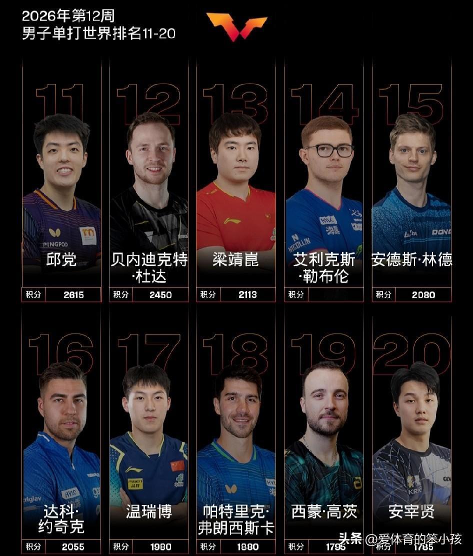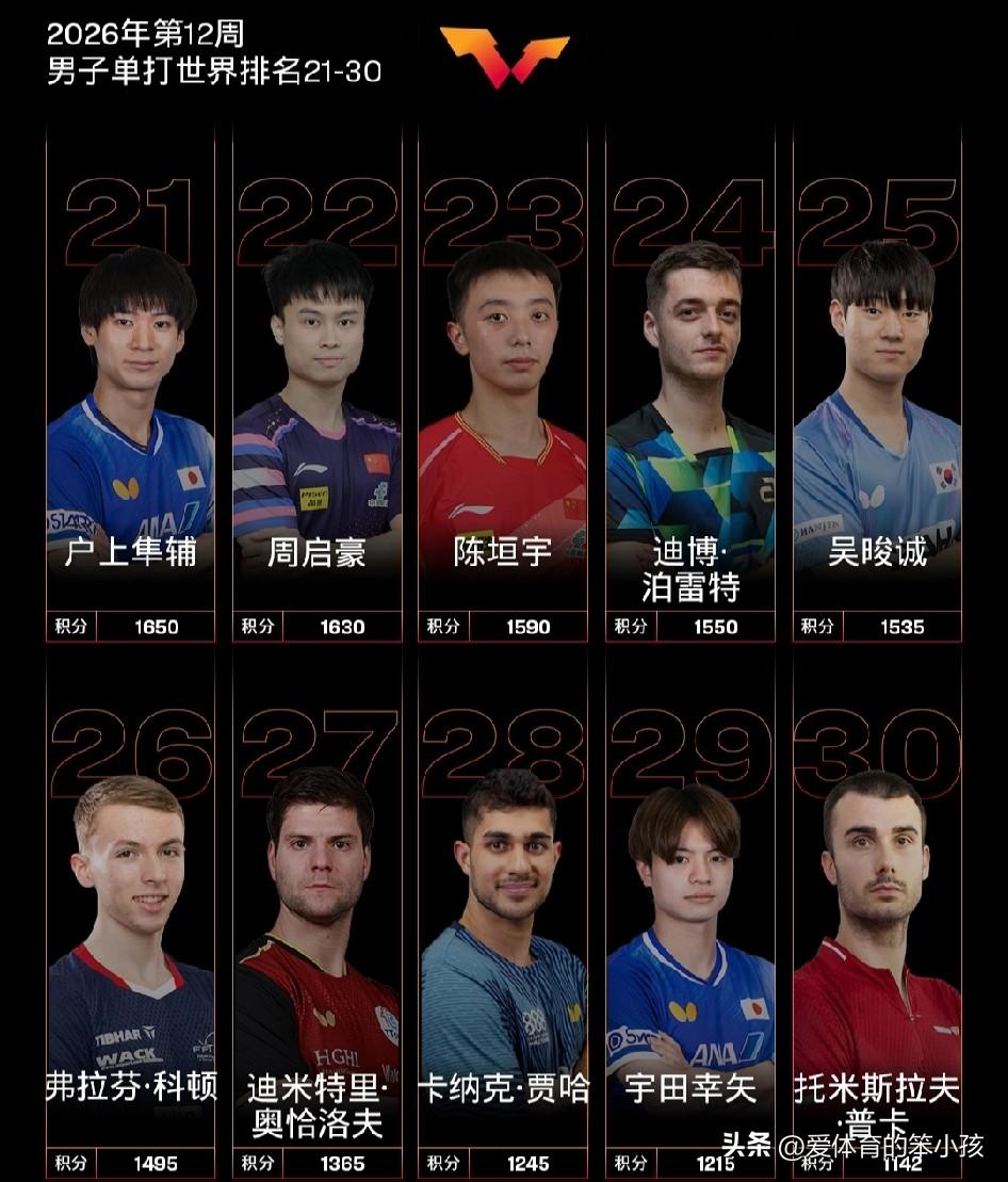 刚刚结束的WTT重庆冠军赛,虽然国乒男队和国乒女队在最后一个争冠日的比拼当中,进入决赛的球员蒯曼和温瑞博双双输掉决赛,丢掉最后的单打冠军,但是对于国乒团队来说也算是各有所得。至少在锻炼年轻人并给他们成长和试错机会的情况下,是有所收获的,也为年轻球员的成长带来了更便利的条件。这就是这次重庆冠军赛国乒团队最大的收获。 当然经过这次比赛之后,最新一周,也就是2026年第12周的单打最新排名也随即出炉。在男单方面,明显国乒团队的竞争优势要比女乒方面弱了不少。因为世界女单前十排名当中国乒球员占据6席,而男单方面则只占据3席,而且这3席除了王楚钦世界排名第一的位置,还有10750分的积分算是遥遥领先之外,其他队友林诗栋和向鹏虽然依然位列世界前十行列当中,但是目前分别以5755分和2950分位列世界男单排名的第五和第九位,已经让中国男乒的整体排名优势荡然无存。 其他协会当中,目前前10排名当中也算是多家协会分庭抗礼。其中日本男乒是在前十当中占据两席,分别是张本智和以6000分的积分位列世界男单排名的第四位。他的队友松岛辉空则以3785分位列世界男单排名的第八位。 另外,来自瑞典的莫雷加德和来自巴西的雨果卡尔德拉诺,分别以6565分和6080分位列世界男单排名的第二和第三。 刚刚在重庆冠军赛上锁定单打冠军的法国小将费利克斯勒布伦,则以5720分占据世界男单排名的第六位。晋级八强而无缘后面四强争夺战的林昀儒则收获4225分的排名分。位列世界男单第十排名的是这次缺席了重庆冠军赛的韩国高手张禹珍,他目前的世界排名积分为2616分。 另外,在世界男单第11到第20的排名当中,共有两位国乒球员。他们分别是曾经占据过世界排名前五位置,也曾经是国乒前3号或者前4号主力的老将梁靖崑,目前排名世界男单的第13位,他现在的排名积分是2113分。而另一位国乒小将——刚刚在重庆冠军赛上锁定男单银牌,并战胜了莫雷加德和张本智和这种高手的温瑞博则以1980分,位列世界男单排名的第17位。他也是这次排名更新当中世界排名提升最明显的一位球员,直接提升了10位。 另外,德国的邱党和杜达两位队友,以及来自法国的费利克斯兄弟当中的哥哥艾利克斯勒布伦,包括丹麦的另一位名将林德,分别占据世界男单排名的第11、12和14以及15位,他们目前对应的排名积分分别是2615分、2450分和2110分,以及2080分。 另外,德国和法国的另两位名将弗朗西斯卡以及西蒙高茨,目前分别占据世界男单排名的第18和19位。他们现有的积分分别是1880分和1795分。而来自斯洛文尼亚的达科约奇克近期则在世界赛场上状态起伏明显,有一些原本被认为他能取胜的比赛也没能成功胜出。所以世界排名继续下滑,以2055分位列世界男单排名第16位。韩国的另一位名将,曾经站上过世乒赛四强位置的安宰贤以1785分位列世界男单排名的第20位。 而在第21到第30位的排名当中,也出现了两位国乒球员的名字。他们分别是周启豪和陈垣宇。目前他们分别以1630分和1590分,位列世界男单排名的第22和23位。也正是这种排名,才让他们还有机会在各种世界乒乓球男子团体的较量当中,有机会晋级国乒的最后正式参赛名单。而日本的另一位高手户上隼辅,则以1650分位居世界男单排名的第21位。他的队友宇田幸矢则在近期状态稍微有所复苏的情况下,以1215分位列世界男单排名的第29位。 另外。韩国的另一位高手吴晙诚尽管近期参赛次数不多,仍以1535分位居世界男单排名的第25位。法国男乒的4号和5号主力博雷特,还有科顿两位球员则以1550分和1495分的排名分,分别是占据世界男单排名的第24和26位。这也可以看出法国队的整体竞争力现在确实逐步提升,已经具备了向国乒,日本男乒,还有韩国男乒包括德国男兵发起挑战并战而胜之的实力。 而德国老将奥恰洛夫目前是以1365分,占据世界男单排名的第27位,整体实力有所下滑,参赛次数有所减少也成为他世界排名继续下落的一大关键。而美国名将卡纳克贾哈以及来自斯洛文尼亚的另一位高手普卡,则分别以1245分和1142分,位列世界男单排名的第28和30位。 整体上来说,欧洲球员在世界男单第11到第20、第30的排名当中,占据的位置还是比较多,而前十当中亚洲球员则更占优势。欧美球员当中莫雷加德、卡尔德拉诺以及小勒布伦也成为目前对亚洲所有顶级高手,最具备竞争力的3位球员。 那么大家对于目前世界乒乓球男单排名的这种变化和整体布局又有何种想法看法?期待朋友们给出自己清晰的答案,大家共同交流探讨。