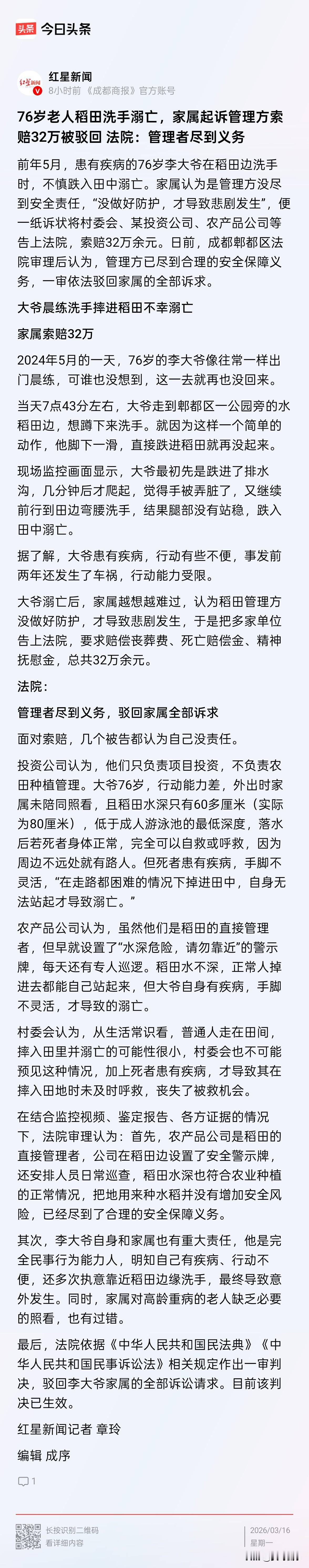 “并非谁死谁有理!”四川成都,一七旬大爷早起锻炼时,路过一片稻田,当他来到稻田边蹲下洗手时,不慎滑倒跌入田中溺亡。而后,大爷的家属难过之余,将村委会、农产品公司告上法院,索赔损失合计320000余元,法院这样判了! 2024年5月份的一天清晨,76岁李大爷和往常一样出门晨练散步。 李大爷年纪大了,之前还遭遇过车祸,腿脚一直不太灵便,平时走路、起身都比常人要吃力,身体状况也不算太好。 当天早上七点多,李大爷走到一处公园附近的水稻田旁边,大概是路上手沾了灰尘泥土,便想就近蹲在田边洗洗手。 可田埂泥土松软潮湿,加上老人本身行动不稳,脚下一滑就摔进了排水沟中。 他挣扎着爬起来之后,还是想着把手洗干净,于是又慢慢挪到水稻田边缘,弯腰的一瞬间,身体失去平衡,直接倒进了田里。 这片稻田水深只有80厘米,换成正常人,站起来、喊人求助都很容易,可李大爷年纪大、行动受限,摔倒之后又无力起身,最终不幸溺亡在稻田里。 而这一幕的发生,都被附近的监控完整拍下。 好好的人出门晨练,却以这样的方式离开,李大爷家人心里既悲痛又难以接受。 他们即便知道李大爷的死是场意外,但在悲伤情绪之下,还是认为稻田的管理方没有做好安全防护,对李大爷的死难辞其咎。 于是,他们将相关的投资公司、管理农田的农产品公司以及村委会一并告上法庭,要求赔偿各项损失共计32万余元。 面对索赔,几方被告都给出了自己的说法。 投资公司表示,他们负责项目投资,并不参与农田的日常管理,老人出事更多是因为自身身体原因,家属方没有陪同更应当反思。 农产品公司则解释,他们作为直接管理方,早已在田间显眼位置设置了“水深危险、请勿靠近”的警示牌,也安排了人员日常巡查,并不存在安全管理上的疏漏。 村委会也认为,正常在田间行走,摔进稻田溺亡的概率极低,这样的意外根本无法提前预见和防范。 那么,法院又会怎么判呢? 根据《民法典》第1165条规定,行为人因过错造成他人损失,应当承担侵权责任。无过错则不担责; 同时该法第1198条还规定,安全保障义务主要针对宾馆、商场、车站等经营场所与公共场所,农田属于农业生产用地,不在此列,对于管理者而言,仅需承担合理限度内的安全注意义务。 法院在查看监控并结合多方证据后认为,无论是村委会,还是农产品公司,均已尽到了合理的安全提醒和管理义务,对李大爷的死亡不存在过错。 对于李大爷本人而言,其作为一名具有完全民事行为能力的成年人,明知自身行动不便,还主动靠近稻田水域,最终导致其溺亡结果的发生,其本人应承担主要责任; 而李大爷的家属,显然对高龄多病的老人没有尽到到妥善照看义务,同样存在相应责任。 最终,法院驳回了家属的全部索赔请求。 事后,这件事也引起了网友的热议。很多人都同情老人的遭遇,也理解家属失去亲人的痛苦,但绝大多数网友都支持法院的判决。 大家觉得,农田不是景区,也不是游乐场所,不可能像公共场所一样全面封闭、加装护栏,管理者只要做好提醒义务就已经足够。 李大爷家属的说法无异于强人所难。 还有网友直言,家里有高龄且行动不便的老人,外出时最好有人陪同,尽量远离水边、田埂这些危险地方,李大爷的家人才是最该负责和反思的人。 总的来说,“并非谁死谁就有理!” 失去亲人的悲伤固然值得同情,但法律不会因为情绪就模糊责任边界,同情更不能与责任划等号。 对于老人来说,量力而行、远离危险;对于家人来说,细心看护、时刻陪伴,才是避免悲剧发生最有效的方式。 对此,你说呢?欢迎大家在评论区留言。(注:图片仅供参考)