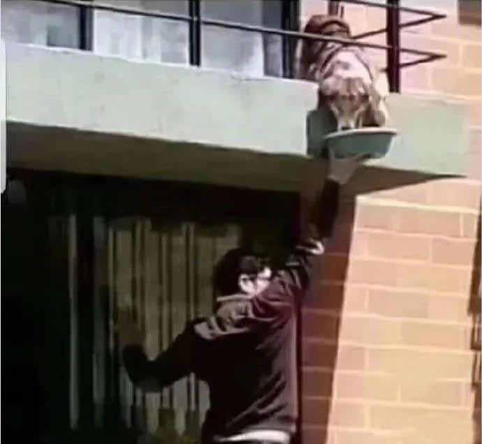 家里的狗狗饿得不停的哼叫着。这段时间以来,全凭楼下这位热心邻居,每天冒着高空危险手托食盆给狗喂食。看来这家主人平时与邻里关系相处得好,待主人回家后,还真要感谢这位好邻居。此时的我们看到这一情景都深为感动,为这位热心的好邻居点赞!