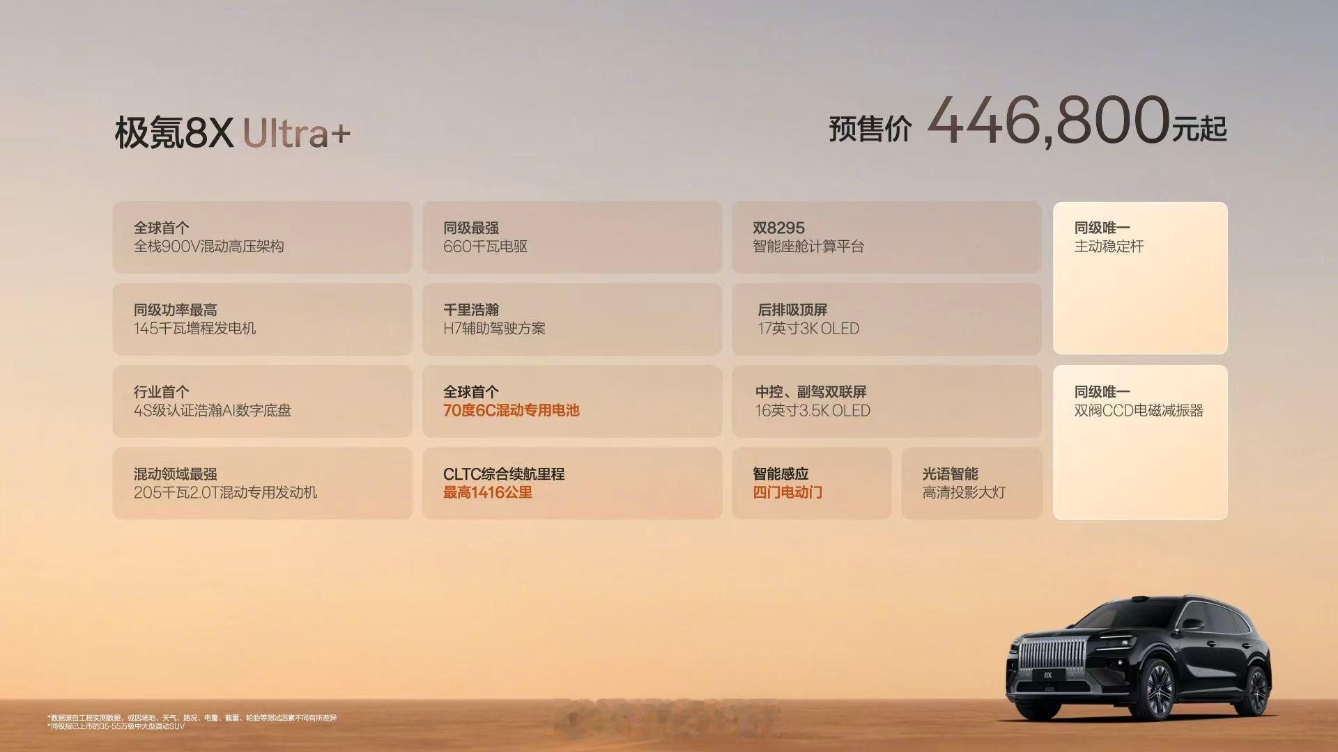 极氪8X预售37.68万起 极氪8X在大气外观和性能舒适上,更能满足家庭用户的情绪价值。这两台车,是最新的900V跟400V对比,是最高70度6C大电池跟53度4C电池对比,是地形能力更强的动力、底盘跟家用的对比。加上从9系起,极氪在情绪价值提供上开始爆发,持续推出更大气的原创设计,全球唯二的宾利同款音响和百万性能车底盘配备主稳杆,8X可能完全不像其它8系那样只能满足家庭用户了。极氪8X预售38分钟破万