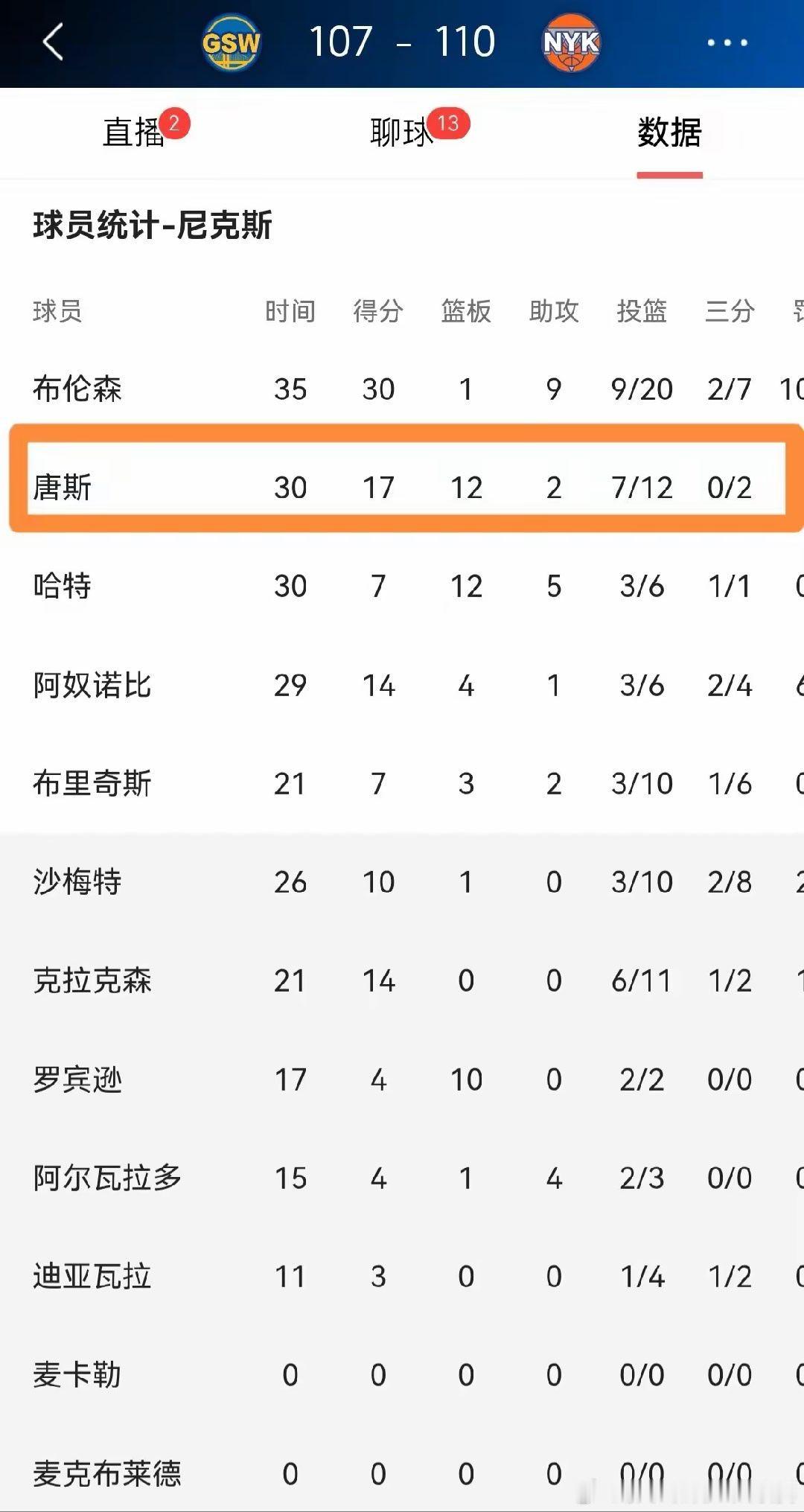全场比赛下来,唐斯首发出战30分钟,投篮12中7,其中三分球2中0、罚球4中3得到17分12篮板2助攻,还有3次失误和2次犯规