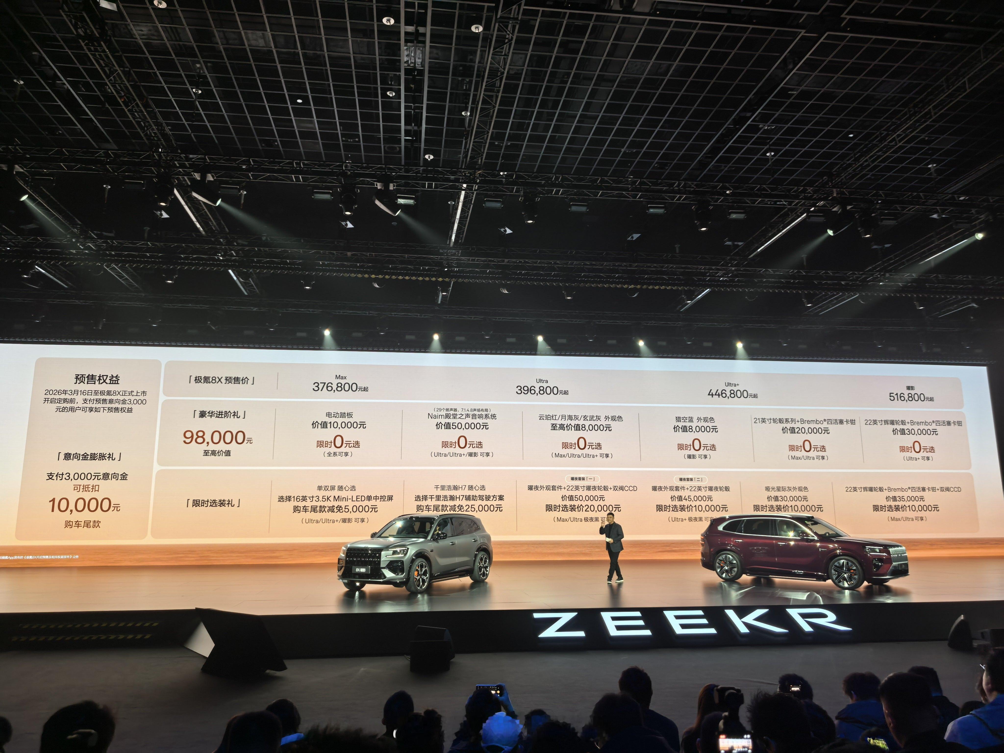 极氪8X新公路之王预售价37.68万元起,搭载9X同款浩瀚S超级电混架构,延续极