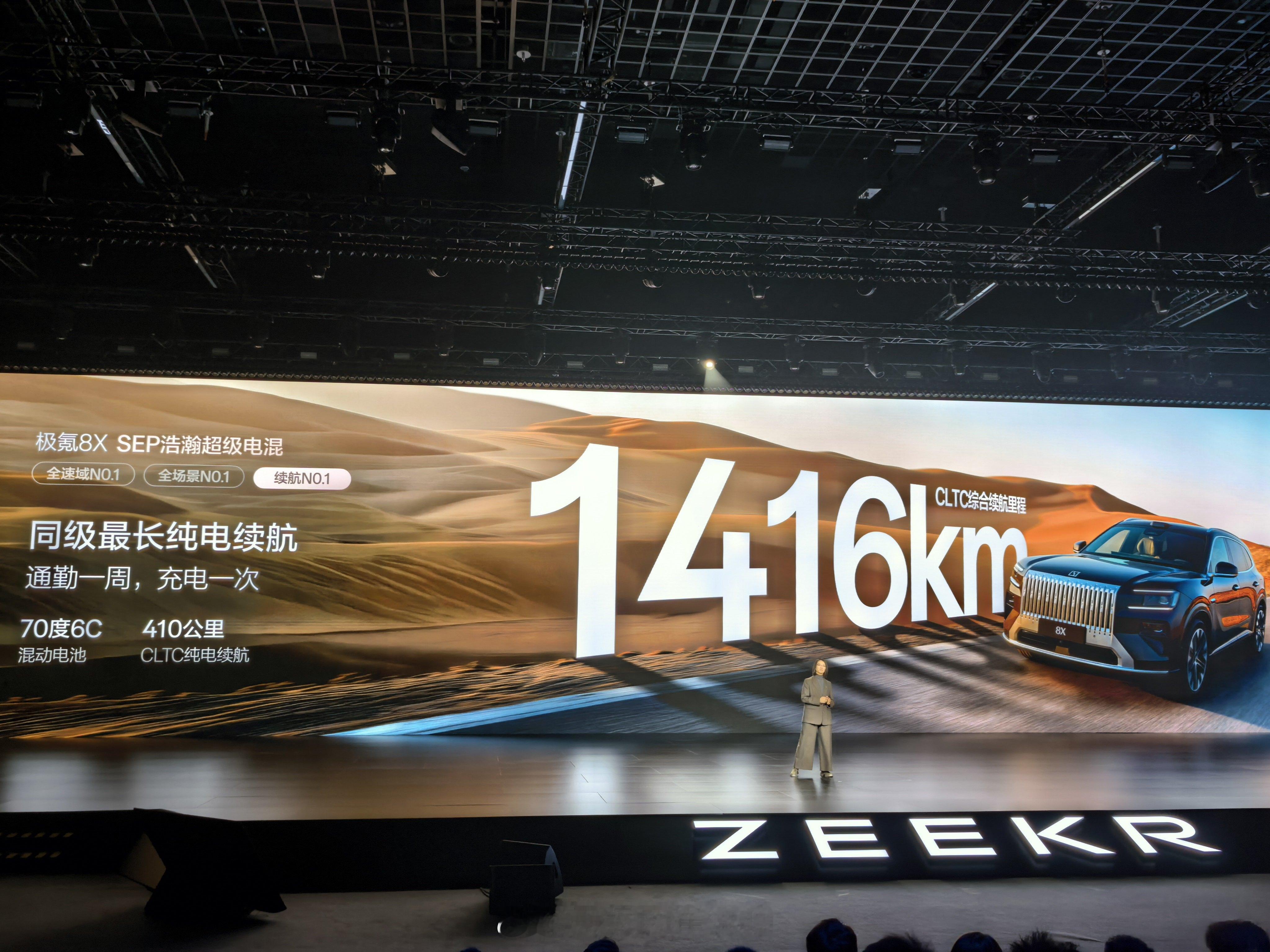 极氪8X新公路之王预售价37.68万元起,搭载9X同款浩瀚S超级电混架构,延续极氪的硬核堆料风格,70度6C电池,CLTC续航1416公里,零百加速2.96秒。极氪8x新能源汽车