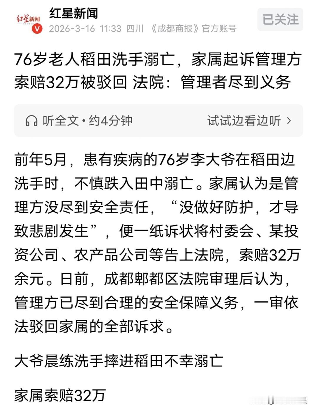 “不是谁死谁有理!”四川成都,76岁老人腿脚不利索,去稻田边溜达,2次蹲下洗手,脚下打滑,跌进稻田溺亡,家属直接将村委、某投资公司,农产品公司告上法院,索赔32万,三方各自拿出证据辩驳,法院判决有亮点。 2024年5月,早上7点43分左右,76岁的李大爷跟往常一样出门晨练,这位大爷一身病,前两年出过车祸,腿脚也不利索,走路也不方便。 李大爷晨练走到一个公园旁的水稻田边时,他觉得手脏了,就想洗个手,便蹲在稻田边俯下身,把手伸进稻田的水里洗手。 就这么一个再平常不过的动作,意外突然发生了——大爷脚下一滑,直接栽进了稻田里边缘的排水沟里。 可李大爷挣扎着爬起来后,可能觉得手沾了泥水,没洗干净,又走到另一块田边弯腰洗手,结果腿没稳住,再次跌进田里,这一次就再也没能爬起来,最终溺亡了。 这一幕都被监控清清楚楚的拍了下来。 李大爷突然意外离世,家属是悲痛欲绝越想越觉得这事不能这么算完,好好的人出门晨练,结果人没了,就是因为稻田没防护好,要是管理方把田边弄安全、管理好了,这事根本不会发生。 于是,家属把村委会、负责项目投资的公司、还有种稻田的农产品公司全告上了法院,张口就要32万多的赔偿,包括丧葬费、死亡赔偿金还有精神抚慰金。 可这三方都觉得冤枉,这事明摆着是李大爷身体不好,怎么能怪到别人身上呢? 投资公司说:我只负责投钱,又不管种水稻,凭啥找我?再说李大爷76岁了,行动都不利索,出门家属也不跟着照看,稻田水才80厘米深,比成人游泳池浅多了,正常人掉进去都能站起来,就是大爷自己有手脚有毛病,他自己站不起来才溺亡的。再说不远处有路人,他为啥不喊人求救呢? 农产品公司也说:我们是直接管稻田的,但我们早就在田边立了“水深危险,请勿靠近”的牌子,还天天派人巡逻。水深度正常,正常人掉进去也能站起来,就是大爷本身就有疾病,他自己不注意,才出的事。 村委会更是直接说出自己的理由:平时普通人在田边走,摔进田里溺亡根本不常见,这事儿我们没法预料。而且大爷有重病,家属也没好好照看老人,这才是悲剧的原因。 法院最后审下来,给出的结果是:驳回家属的全部诉讼请求。 看完判决,有人可能会嘀咕:老人没了就这么算了?稻田管理方真的一点责任没有吗? 其实这事的焦点,在于“合理的安全保障义务”是否尽到了。 咱得明白,不是出了事就必须有人背锅,管理方的责任也是有边界的。 《民法典》第1198条规定:宾馆、商场、银行、车站、机场、体育场馆、娱乐场所等经营场所、公共场所的经营者、管理者或者群众性活动的组织者,未尽到安全保障义务,造成他人损害的,应当承担侵权责任。 农产品公司作为直接管稻田的,立了警示牌、派了人巡逻,水深度也符合种水稻的正常标准,该做的都做了,这就算尽到安全保障义务了。 另外,李大爷这边也有很大的责任,老人是完全民事行为能力人,明知道自己年纪大、腿脚不利索、还有病根,却执意往稻田边这种不是休闲场所的地方散步,他洗手本可以找水龙头、洗手台,可他非要在稻田里洗手,这本身就没尽到自己的注意义务。 还有,家属对高龄又有病的老人,也没尽到必要的照看责任,老人独自出门晨练,没人陪同,风险自然大大增加。 生活里这种事儿不少,出了事,就先推卸责任,让别人负责。 但法律讲的是情理,更讲规则。 不是所有意外的后果,都要找个“背锅侠”。 生活中,对身体弱,行动不便的老人和家里的孩子,家属都得多上心、多注意,多叮嘱,其实,很多悲剧是可以避免的。 最后想说,别一出事就总想着把责任往别人身上推,要先想想自己有没有尽到该尽的义务。 你对此事有什么看法呢? 图片来源于网络