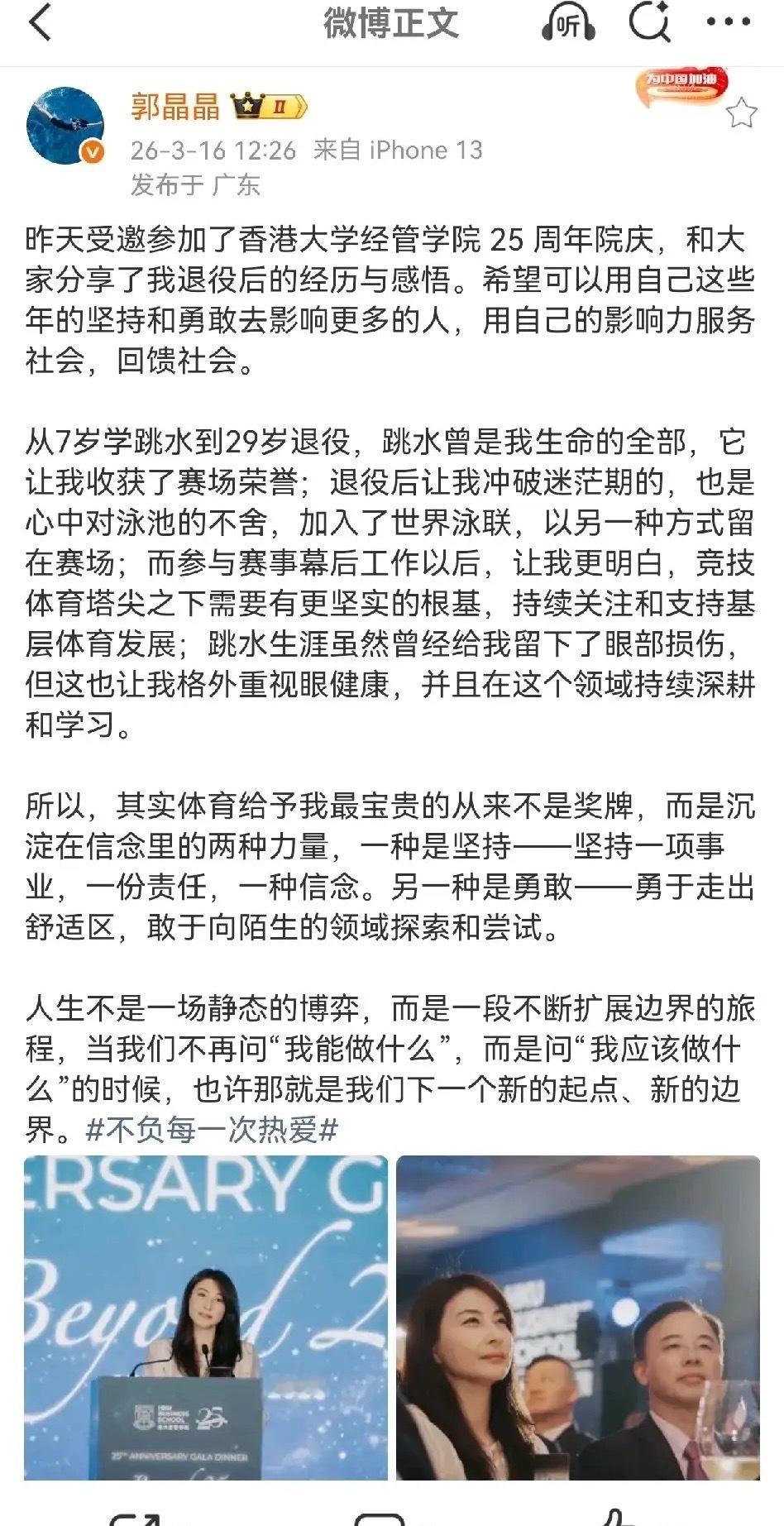 值得一提的的是,郭晶晶早年跳水留下了眼部损伤,她没有心生不满,反而让她格外重视眼健康,在这个领域深耕学习并帮助到更多的人。在港大的分享里,她坦言体育给她最宝贵的从来不是奖牌,而是刻在信念里的两种力量:一种是坚持,对事业、责任和信念的坚守;另一种是勇敢,敢于走出舒适区,向陌生领域探索。她还说,人生不是静态博弈,而是不断扩展边界的旅程。当我们从问“我能做什么”变成“我应该做什么”时,就是新的起点。这番通透又有力量的话,让大家看到了奥运冠军退役后,依然在用热爱和责任影响更多人。