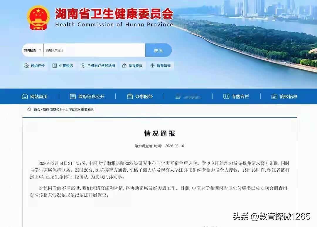 中南大学2023级研究生孙同学失联,后确认于橘子洲大桥坠江,校方与卫健委已成立联合调查组。 孙同学生前朋友圈控诉导师谷某安排大量非学业工作严重影响规培,还遭其辱骂威胁,另一位曾老师的加入加剧了她的压力。 她多次向学校反映无果后曾跳楼轻生,被救后送精神科贴标签、签保证书,还遭反复训斥,最终再度轻生,遗言希望学校不牵连家人和帮助过自己的人。 孙同学的悲剧,本质上是一场弱势个体求助无门的系统性困境。 她并非没有发出过求救信号,从向辅导员、教务办反映问题,到极端跳楼行为,每一次都是向校园伸出的求助之手,可这些手最终都被推开。 校园本应是搭建求助通道的主体,可在她的经历里,反映问题无人核查、心理危机被简单贴“精神病”标签、维权反而遭训斥追责,原本该层层递进的帮扶通道,变成了层层阻隔的闭环死路。 当学生发现,向学校求助不仅解决不了问题,还会给自己带来更多二次伤害,那最后的绝望便成了必然。 师生权力失衡下,学生本就处于弱势,校园的核心责任,本应是为这份失衡建立缓冲带和纠错机制,而非成为弱势一方的又一层压力。 如果反映问题的成本是被质疑、被贴标签、被追责,那再完善的心理健康制度,也只是停留在纸面上的空文。 校园的任何制度,最终都要落到让人敢求助、有人接求助、能解决求助上,否则,再多的善后与调查,都换不回年轻的生命。
