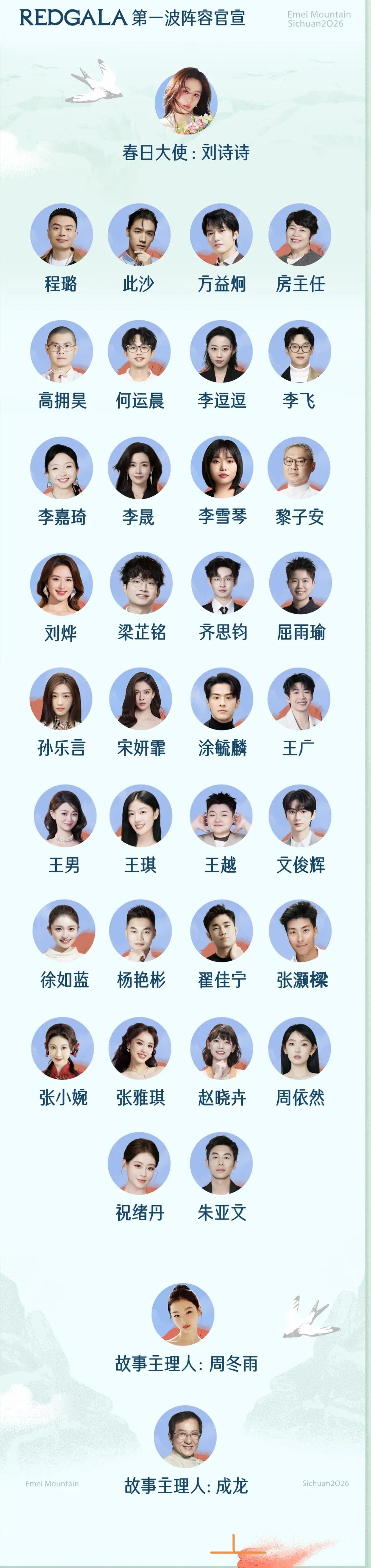 3.27小红书REDGALA故事幻城·峨眉山即将开启📅 时间:2026年3月27日📍 地点:峨眉山第一波嘉宾:刘诗诗、成龙、周冬雨、文俊辉、此沙、李晟、宋妍霏、李嘉琦、张小婉、祝绪丹、李雪琴、朱亚文、何运晨、齐思钧、张雅琪、程璐、小齐、赵晓卉、周依然、房主任、王越、翟佳宁、李逗逗、李飞、王广、王男、孙乐言、涂毓麟、王琪、徐如蓝、方益炯等