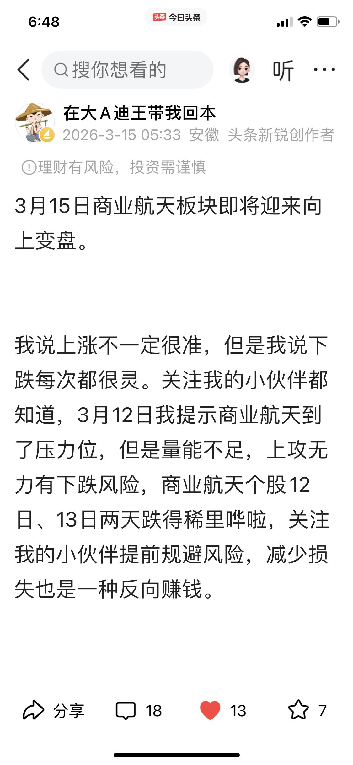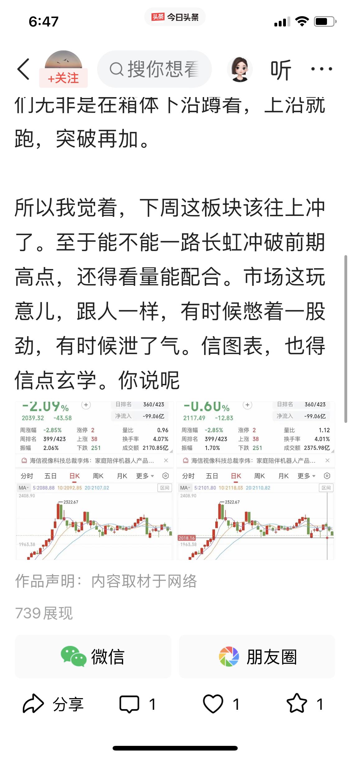 我也是好起来了,有人来搬运我的作品。 上周末我发了个关于商业行业本周会向上反弹的视频,里面详细分析了支撑和压力点位,还配了分析用的图片。结果呢,有人直接拆解、微改动后就拷贝发出去了,内容和我的大致一样,点位一毛一样,连图片都没换。尊重劳动成果,禁止搬运[泣不成声] 我每天免费做分析、分享心得,就是想和大家交流。喜欢我内容的朋友,麻烦动动小手点点赞、点点关注、转发下作品,祝大家生活愉快,股市长虹发大财!