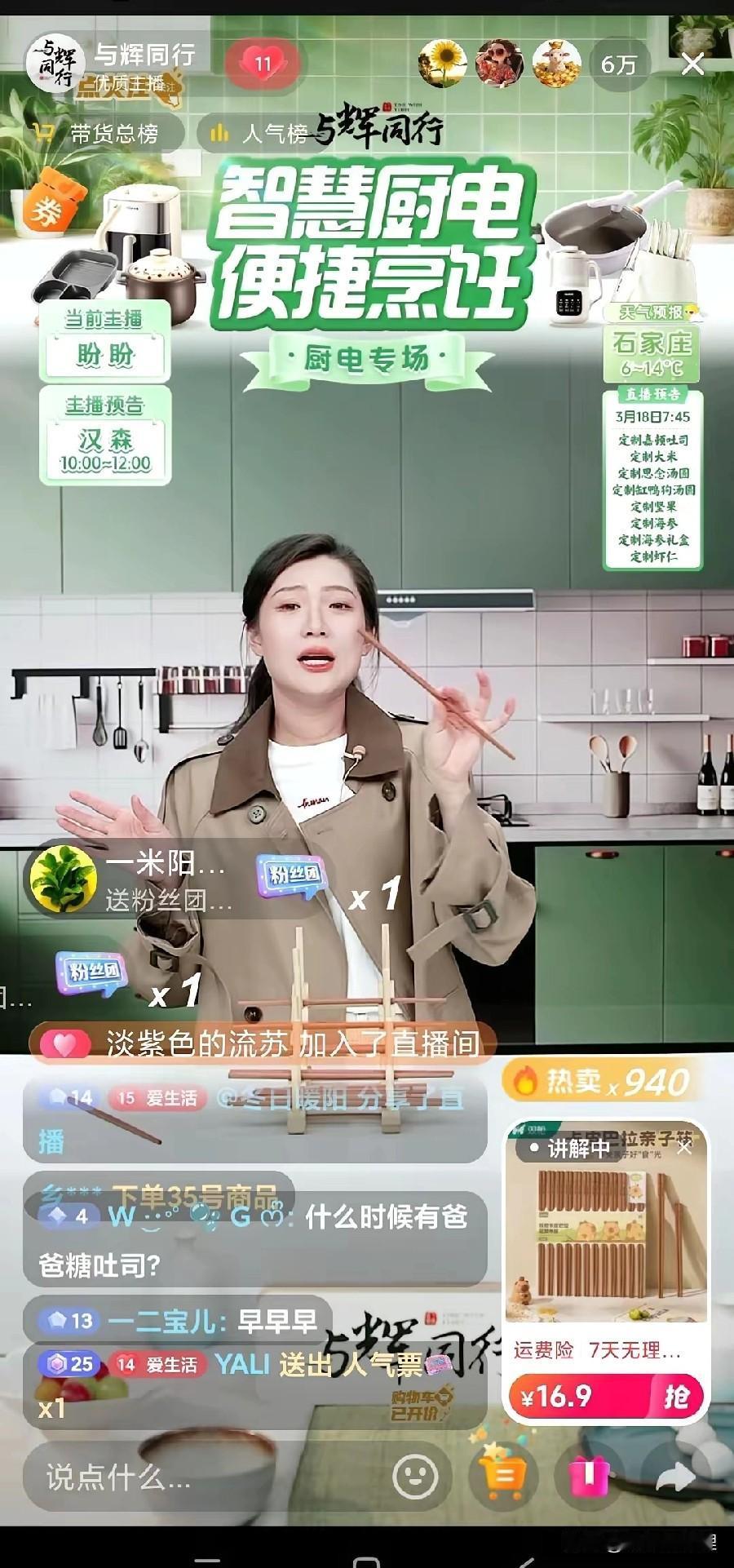 这网上的风向也真有意思,越是黑得厉害,人家反而越火。 刚进与辉同行直播间,好家伙,九万多人在线,这人气真不是盖的。 今天董老师休息,盼盼穿件卡其色风衣在那儿讲厨具,整个人看着特别利落。 我觉得这帮粉丝挺有主见,前两天那个鸡爪的事儿闹得沸沸扬扬,结果呢?压根没影响。 直播间那绿植衬着厨房背景,看着就舒心。盼盼讲东西不整虚的,材料、用法说得明明白白。 这下咱们可算是看清了,那种信任感不是靠几个黑粉带节奏就能搞垮的。 说白了,大家伙儿眼睛都不瞎,谁在用心做事,谁在故意找茬,心里都有杆秤。 这波逆风输出,反倒是把粉丝粘性给焊死了,你说气人不气人?
