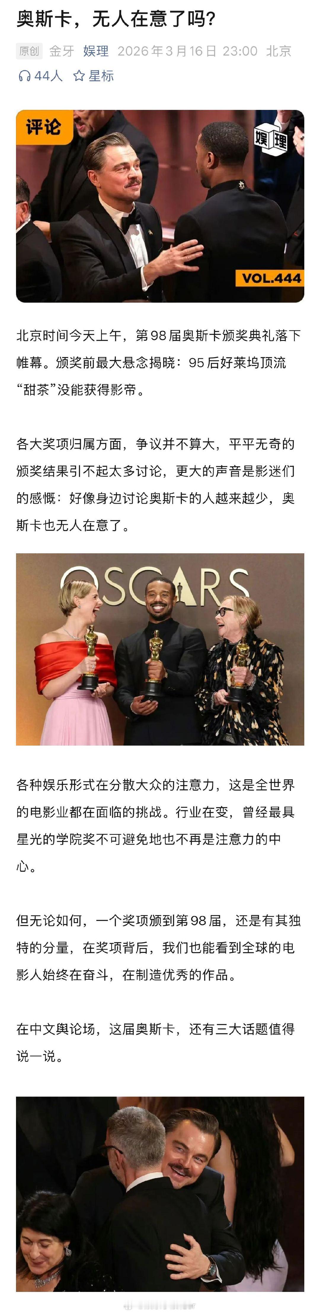 kpop征服奥斯卡了吗 甜茶会成第二个小李子吗 甜茶变苦茶,这是网友在奥斯卡颁奖礼后贡献的金句。落败的真正原因或许是:一方面甜茶在《至尊马蒂》中饰演的角色人设并不讨喜,另一方面,甜茶整个颁奖季的营销策略被指用力过猛、过于高调。奥斯卡造势从来都不是一件容易的事,其中微妙的尺度很难拿捏...娱理独家↓