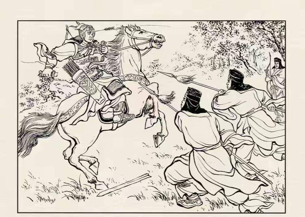 三国演义连环画:这员大将是谁?单马独行时被三名刺客行刺!他手中宝剑断了,脸上也中了一箭,刺客还挺枪刺他,看来性命堪忧啊