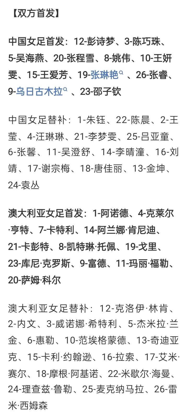 亚洲杯半决赛-中国女足vs澳大利亚:王霜因累计黄牌停赛,张琳艳、王妍雯、乌日古木拉先发出战 03月17日18点,女足亚洲杯半决赛,中国女足对阵东道主澳大利亚女足,赛前双方公首发阵容出炉:王霜因累计黄牌停赛,无缘本场比赛,张琳艳、乌日古木拉、邵子钦先发