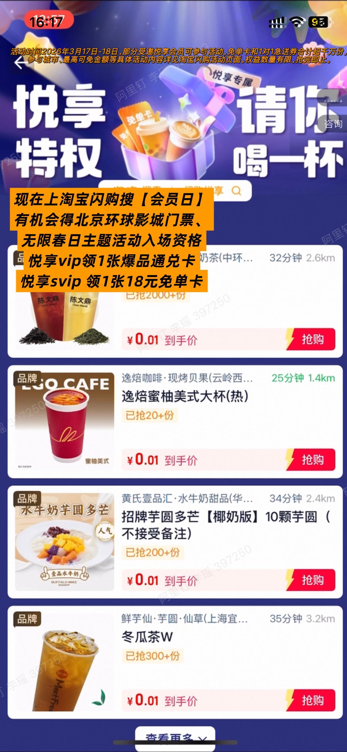 淘宝闪购会员日给到一个夯 作为资深悦享会员,必须来给你们好好安利一波!平常在淘宝闪购下单达成对应消费门槛的就解锁悦享身份了。除了每个月都有1张专属免单卡,我比较喜欢的是2 张 1v1 急送券,忘买东西也不慌,节省时间火速送达。再加上最高888元生活礼包和大牌 5 折起,日常买买买超划算。重点是3月17-18日还能抽北京环球影城门票 、无限春日主题活动入场资格,悦享会员抽奖次数更多,中奖概率也更大!现在上淘宝闪购搜【会员日】,也能抽千万份免单和1v1急送券,错过真的会后悔!