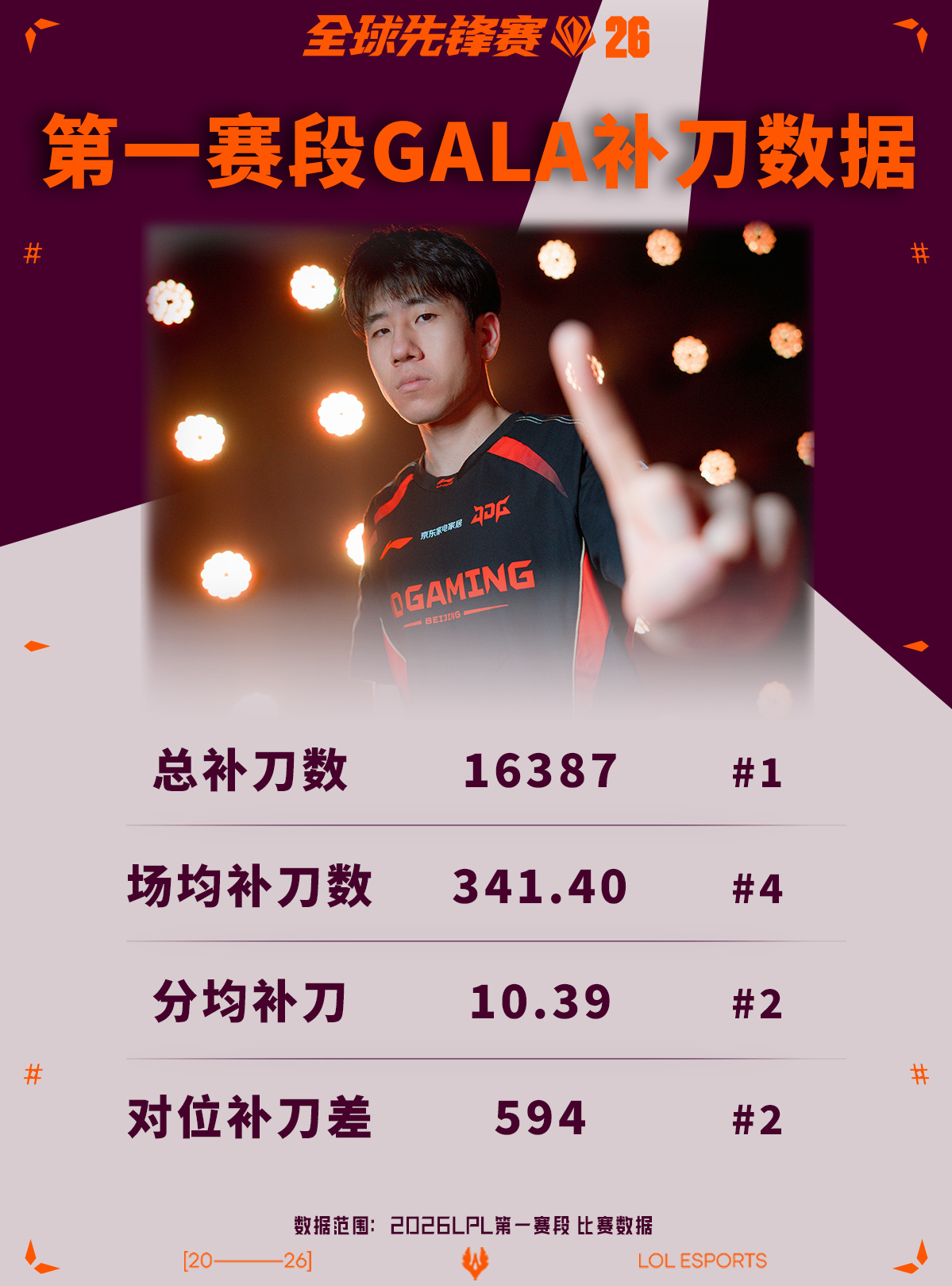 在2026LPL第一赛段比赛期间,GALA选手的各项补刀数据如图。