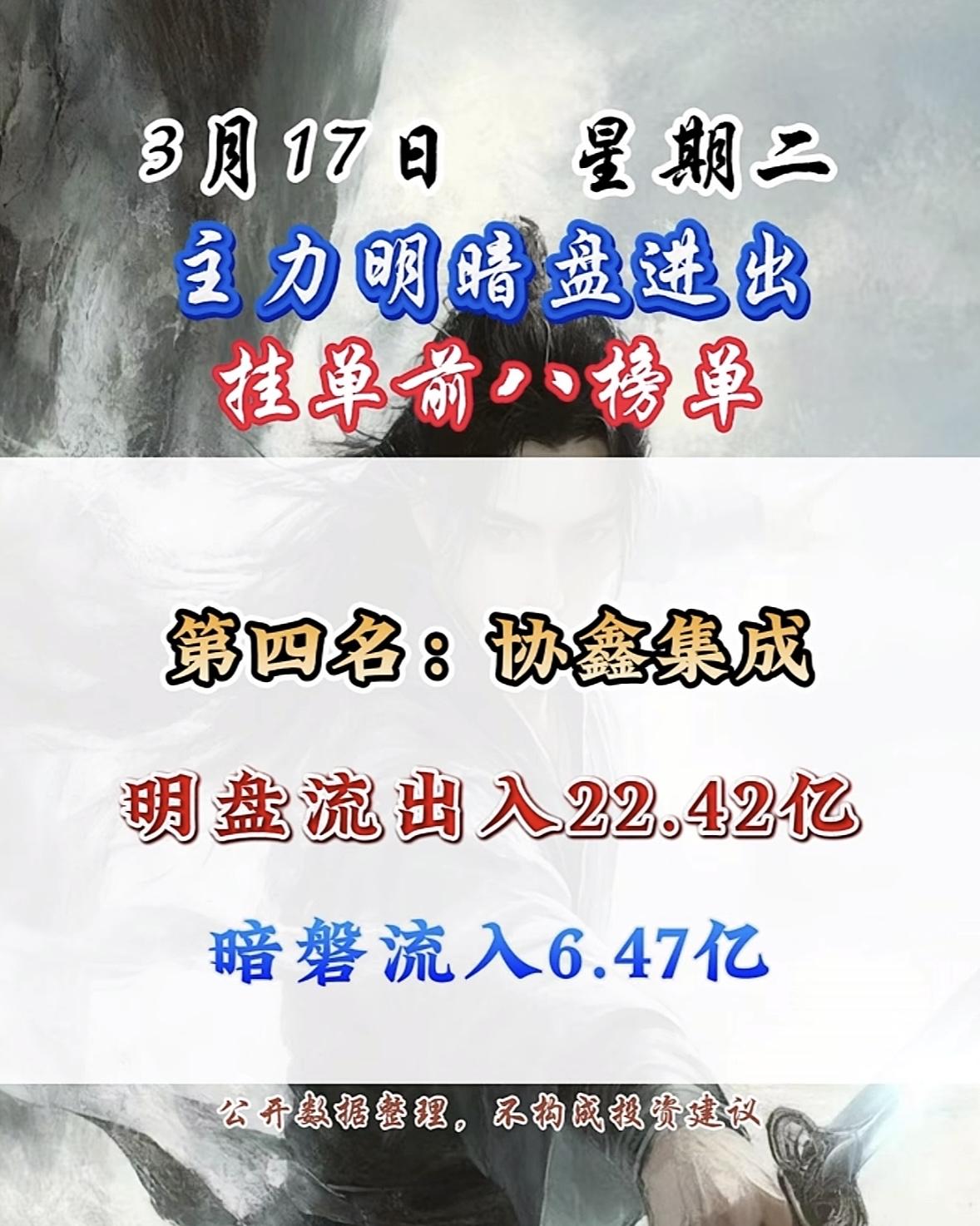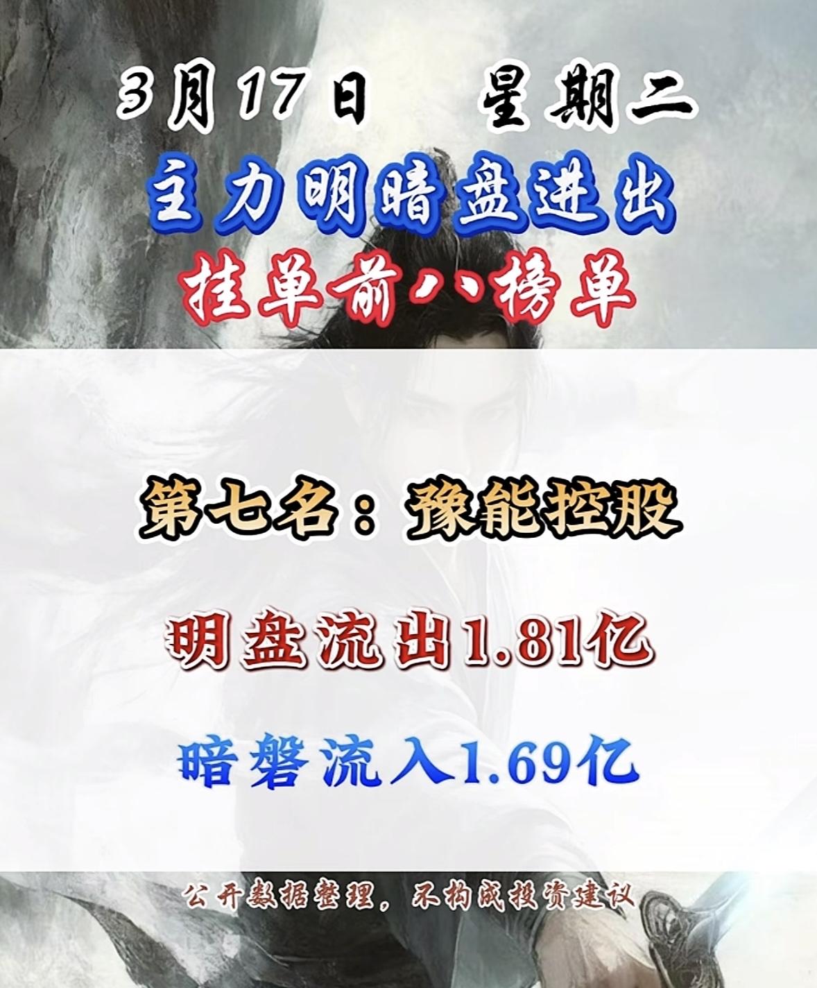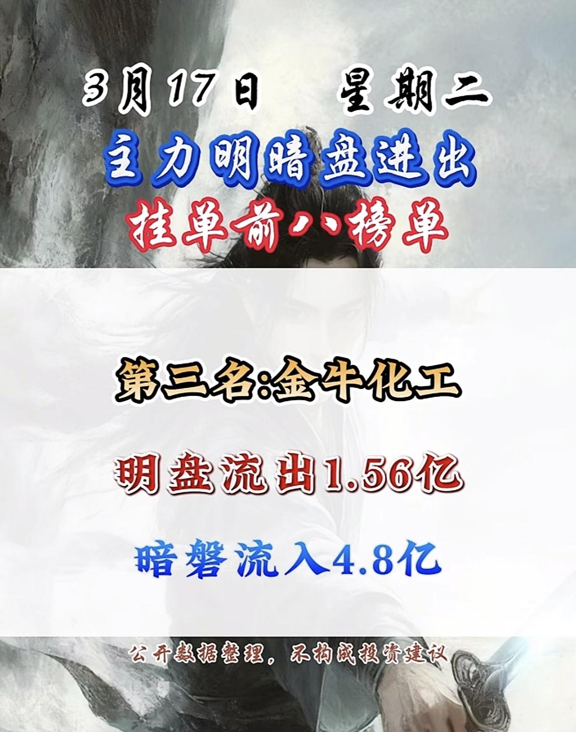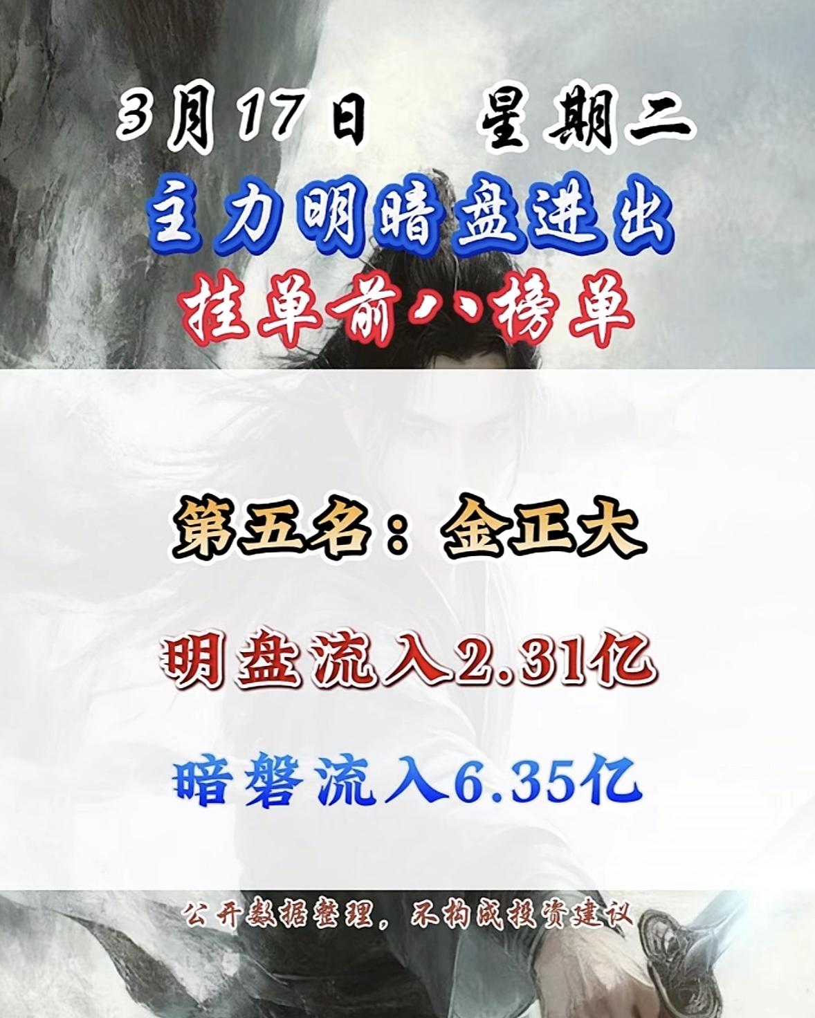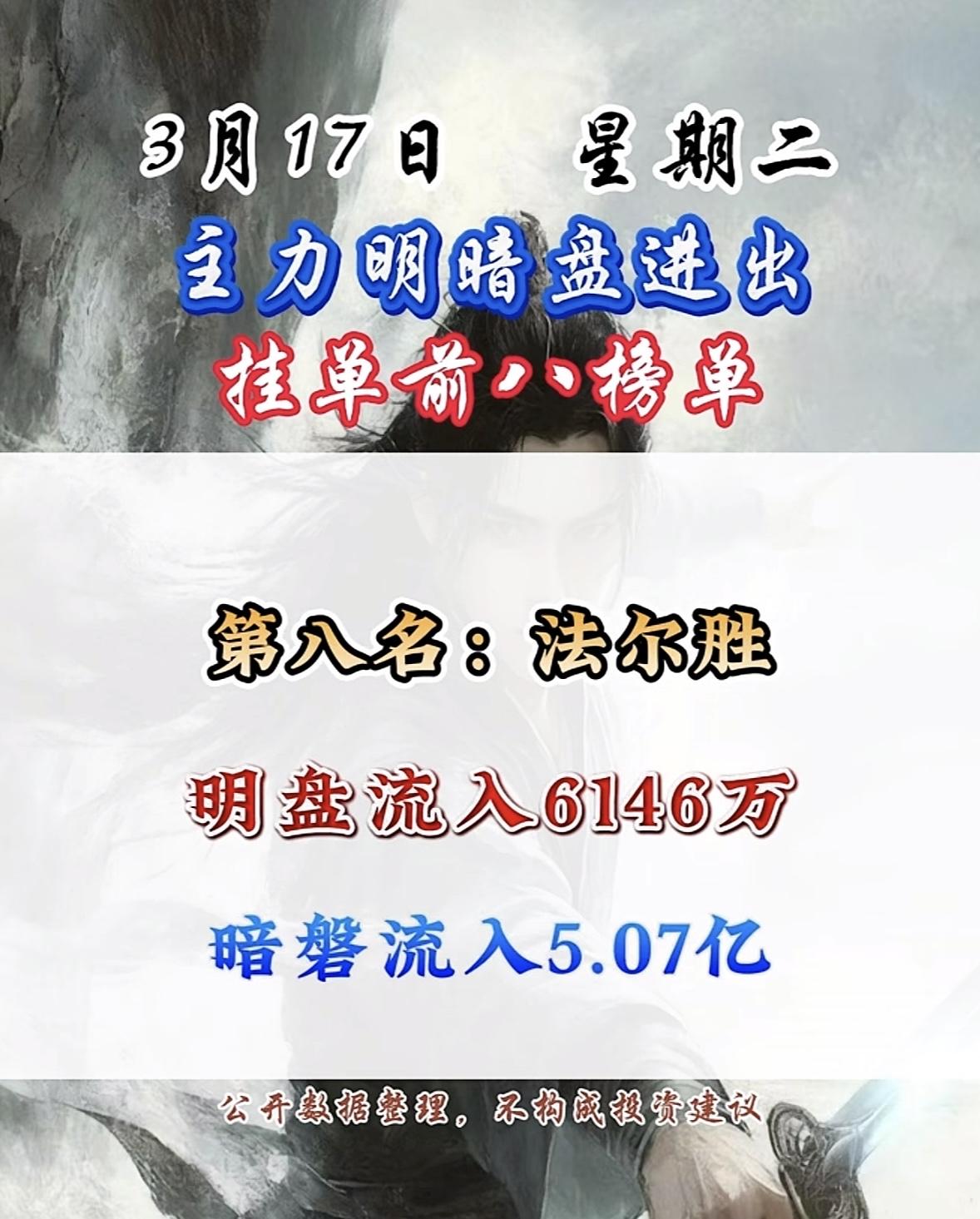3月17日主力明盘+暗盘前8名个股排行榜揭晓。 3月17日主力资金流向很有看头