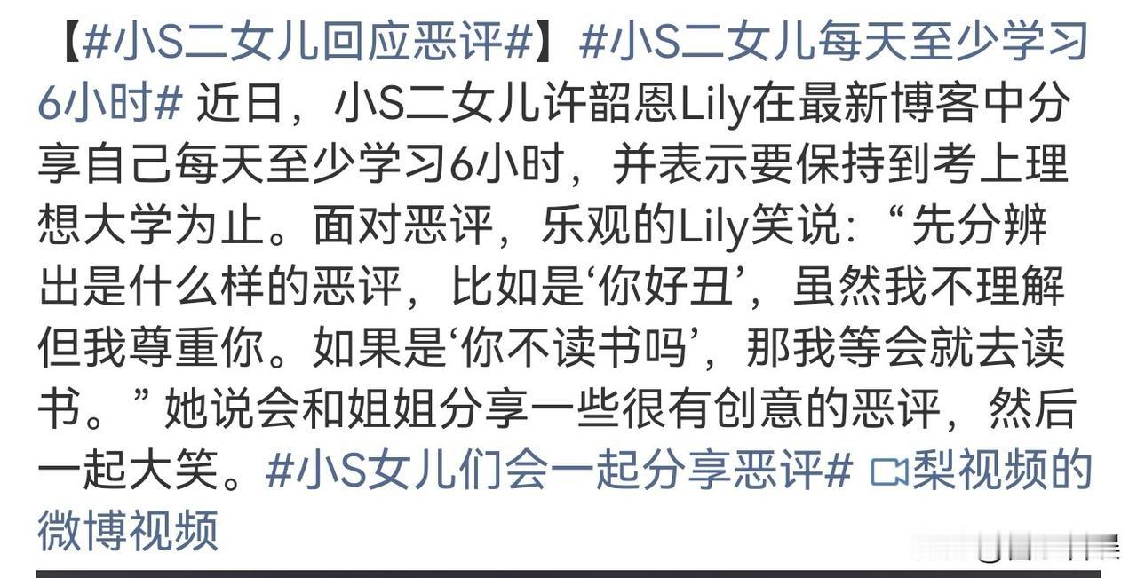 小S二女儿许韶恩,冲上热搜 3月17日晚,小S的二女儿许韶恩(Lily)冲上热搜,原因是她在博客中分享的学习日常与面对恶评的态度,不仅打破了大众对星二代的刻板印象,更凭借超通透的表现收获全网好评。 事情的起因是Lily在最新博客里直言,自己每天至少会投入6小时学习,并且会把这个习惯坚持到考上理想大学为止。 而更让人意外的是,面对网络上的恶评,Lily展现出了远超年龄的豁达与乐观。 她笑着拆解不同类型的恶评,面对“你好丑”的评价,坦然表示虽不理解但尊重;遇到“你不读书吗”的质疑,也从容回应“等会就去读”。 她还会和姐姐分享有趣的恶评,姐妹俩一同大笑化解,这份松弛感和强大的内心,瞬间让网友直呼“太惊喜了”。 作为星二代,Lily一直身处公众视野,却始终没被外界的声音干扰,反而沉下心来专注学业,用实际行动诠释着年轻一代的清醒与坚定。 褪去光环,她既有着年轻人的鲜活,又有着超越年龄的沉稳,这样的状态在年轻群体中格外难得。 Lily的这波分享也让网友们纷纷认可与赞赏:“她至少没有干过什么坏事,很正能量温柔的小姑娘,温柔也是强大的感觉”“在没有真切的经历过别人的伤痛之前,请不要随意对一个人指手画脚,说不定自己经历的时候,未必能有别人豁达”。 小S的二女儿许韶恩是2007年11月份出生的,也才刚成年不久,这个年纪在面对恶评,能有这样的乐观心态,真的挺好的。 你们觉得呢?