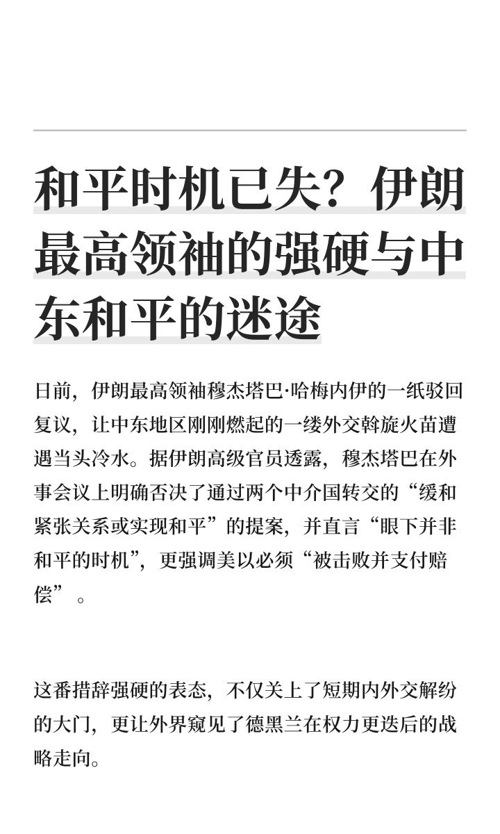 日前,伊朗最高领袖穆杰塔巴·哈梅内伊的一纸驳回复议,让中东地区刚刚燃起的一缕外交斡旋火苗遭遇当头冷水。据伊朗高级官员透露,穆杰塔巴在外事会议上明确否决了通过两个中介国转交的“缓和紧张关系或实现和平”的提案,并直言“眼下并非和平的时机”,更强调美以必须“被击败并支付赔偿” 。
