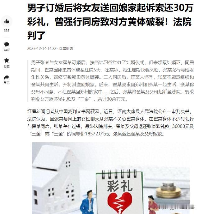 河南,一女子跟男子订婚后,二人举行了婚礼但是没有领取结婚证,同居期间,女子生理期快来了,男子强行发生夫妻之事,结果导致女子黄体破裂。女子住院的时候,还意外发现男子在跟其他女子聊暧昧信息,女子伤心不已,之后跟男子发生激烈争执。男子后来气的把女子给送回了娘家,双方矛盾激化。最后,男方上诉,要求女子返还30万元的彩礼钱。 据悉,男子把女方送回娘家后,女子曾经要求回去居住,但是遭到男子父母的拒绝,不肯女子回到男子的家里来。 (本案例参考来源:红星新闻) 这个订婚,男方给出的彩礼钱可真够高的。 一男子张某跟女子翟某相识之后,二人就确定了恋爱关系,在父母的撮合下,两个人准备操办婚事。 翟某当时没有说领证,而是说,可以先举办婚礼,结婚证后期可以再补。 谈婚论嫁的时候,男方给出的彩礼钱也是相当的丰厚。 在约定订婚事宜的时候,男方给翟某家彩礼钱20万元;另外给出了价值18.5万元的“三金”,其他就是各类红包礼金2.4万元。 如此算来,合计男方订婚合计给出女方40多万元。 因为之前在谈恋爱的时候,翟某看到张某曾经跟其他女性聊天,当时翟某就很生气,质问张某:“你要是背叛我的感情该怎么办?” 当时张某表示:“如果我背叛你了,所有的东西、包括房子都给你。” 空口无凭,当时张某还签订了一份协议——《婚前婚内财产协议》。 协议是这样约定的:张某名下的一处房屋归翟某所有,以及婚房的首付款、还贷部分、增值部分,都给翟某。 针对彩礼部分,张某也将其约定到协议里,表示将近40万元的彩礼钱,包括20万现金、18万的金子、以及其他红包类的,全都留给翟某,张某的父母不可以随意要回去。 看到这个协议,翟某还算挺满意的。 二人就正式开启了甜蜜的同居生活,但是住在一起之后,矛盾频发。 有一次翟某快要生理期了,张某还是强行发生了夫妻之事,导致翟某黄体破裂,之后就去住院治疗。 而令翟某无法接受的是,在治疗期间,她还是看到张某在跟其他女子聊暧昧的信息,这一点让她很生气。 之后就时常的引发矛盾、发生争执。张某竟然直接就把翟某给送回了娘家。 送回去之后,翟某又联系张某,希望他可以过来接她,她想要回郑州跟他一起生活。 但是这个诉求遭到了张某父母的拒绝,他们不肯再接纳翟某,不愿意再共同生活。 与此同时,张某这边也开始上诉,要求翟某返还彩礼钱。 翟某这边表示:男方强行同方,导致女方身体损伤,存在一定过错。 那么,相关部门是怎么判定的呢? 根据《民典法》、结合《民法典》的规定,男女双方没有领取结婚证,也没有长期共同生活,一方要求返还彩礼钱,于法有据,会得到部分支持。 张某跟翟某共同生活的时间比较短,而且彩礼的数额比较高,因此可以酌情要求返还部分彩礼钱。 根据这一点,相关部门酌定做出判决:要求翟某返还13.6万元彩礼钱,以及18.5万元的“三金”钱。 很多人表示,女子付出了身体伤害,最后就得到这份判决书吗,女方是否可以反诉呢? 能够确定的是,女方可以提出反诉。 女方快要生理期,但是男方却强行要同房,男子可能构成侵犯罪。根据《刑法》规定,违背女性意愿,强行发生了关系,可能构成侵犯罪,这是要承担刑事责任的。 即便双反已经订婚、或者是男女朋友关系,如果女方明确表示了拒绝,并不愿意,而男方却强行要亲密,而且还造成了不好的后果,导致女方受伤害。 那么,翟某就可以上诉男方张某获罪,并且还可以主张各类赔偿,包括医疗费用、精神损害抚慰金等。 另外,订婚后男方张某签订了协议,如果存在这些协议约定,比如说背叛感情赔偿、房产归属、彩礼钱归属,翟某也可以凭借协议要求对方履行。 根据《民典法》规定,彩礼协议本质上属于民事合同,具备一定的法律效力。 张某跟翟某都是成年人,在订婚后双方都签订了协议,男方承诺部分房产的归属权、以及彩礼不退等,这些协议符合法律规定,是可以生效的。 所以,如果女方提出反诉,相关部门会尊重这一重约定。 诉诸于“法”,一切都会有转机。 对此,大家都怎么看呢?