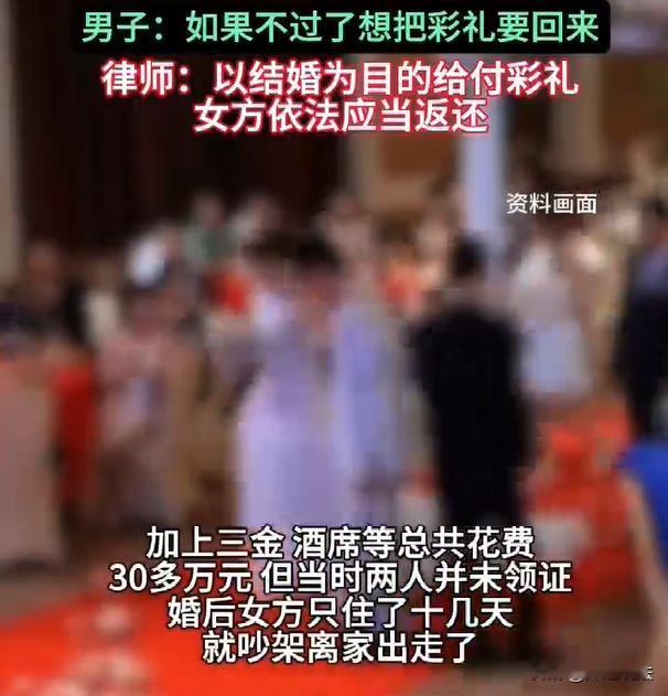 河南濮阳,一男子认识一位离婚带俩娃的女子,相识60天之后就举办婚礼,女子表示暂时不领证,提出的要求是,男子什么时候买房什么时候领取结婚证。随后,男子就花费了30多万元迎娶女子回家,谁知道,结婚才15天俩人就闹矛盾,女子带着20多万的彩礼钱直接离开了男子。男子表示:不想过了可以,但是你要把彩礼钱还给我。 网友表示:这个女子难怪离婚了,太不会处理感情的事情了。而且,还带了两个孩子,人家花30万娶你、给你养孩子,这已经很不错了,就不要作了。 鹊华视频3月17日报道了这则新闻。 来自河南濮阳的吴先生表示,最近他遇到一件烦心事。 单身的吴先生,家里一直催婚,为了能够促成终身大事,吴先生表示,对方即便是一位离婚女子,只要人品好,他也愿意。 于是在介绍人的撮合下,吴先生还真的遇到了一个离婚女子张某(化名处理)。 这位张某不仅离婚了,而且还一个人带着两个孩子。吴先生如果同意这门婚事,他就得接纳两个孩子,并且还要给对方养孩子。 可是,吴先生转念一想,跟谁过日子不是过呢,只要她人好、持家,那么这个婚事,他也能接受。 之后,吴先生就斥资30多万,跟这位张某举办了婚礼。 然而,早在在谈婚论嫁的时候,张某也提出了条件,暂时不考虑领证,等到吴先生买房再说。照张某的意思来看,啥时候买房、啥时候领证。 吴先生感觉,这个条件也行,总之,吴先生也是个老实人。 就这样,二人相识了60天,就准备举办婚礼。 吴先生给出了23万元的彩礼钱给到女方,之后还给了“三金”,举办了酒席,前前后后加起来,合计30多万。 很多网友表示:都做到这个份了,这个女子就知足吧。黄花大闺女嫁人,才几个彩礼钱啊,二婚离异还带俩娃,人家都给了30几万,就好好珍惜吧。 可是,举办婚礼之后,事实并非如愿,张某直接就开始作天作地了。 婚后同居这才15天,张某就跟吴先生吵得喋喋不休,各种生活琐事不合。 最后一次爆发,是因为吴先生提出,想要买个收割机,这样就可以在农忙季节帮人家收割麦子,能赚不少钱。 但是这个提议,被张某一票否决,她认为,要是买这个大机器,那可得花不少钱啊。 而吴先生提出想要买一台车子,要么也可以改善一下生活,对于这个诉求,张某也不同意。 因为两个方案都被张某否定,两个人可能展开了激烈的争吵,随后,张某就拎起包裹,带着两个孩子,直接就离家出走了,吴先生打电话、发信息,张某也不回复。 吴先生最后跑到女方家里表示:你要分开也可以,得把我的彩礼钱还给我。 听到这话,张某的母亲就有些慌张了。这二婚夫妇啊,就是不能提钱的事情。 吴先生也咨询了专业人士,现在双方都表示之后不能再一起生活,加上也都没有领证,并非合法的婚姻关系,女方是必须要返还彩礼钱的。 对于这个事件,核心结论就是:女方很可能需要返还大部分、甚至全部彩礼钱。 根据《关于适用〈民法典〉婚姻家庭编的解释(一)》第五条规定,这三类情形,当事人请求返还彩礼钱,相关部门应该予以支持。 第一、双方没有办理结婚登记手续; 第二、双方办理了手续,但是没有共同生活,或者生活时间很短; 第三、婚前给付方交付彩礼钱之后造成给付人生活困难。 结合本案的情况,吴先生完全符合第一种、以及第二种情形,那就是没有领取结婚证,并且只是短暂的生活、最后还分手了。 彩礼钱是以缔结婚约作为目的的给付款,如果婚姻没有成立,结婚的目的落空,原则上就要返还彩礼钱。 再结合本案中女方的行为,直接就把二十几万的彩礼钱卷走,离家出走,也不接电话也不回信息,主观上可能被认为要恶意占用彩礼钱,所以后面在判定的时候,她可能要返还80%左右的款项,甚至全额返还。 为了结婚,男子花费了30几万,这也不是小数目。本来想要成个家,最后成了空。 人走了、证没领,钱花了,日子过不下去了,吴先生的落差跟委屈,估计只有他自己可以体会了,所以最后准备走法律途径,不仅为了追回钱款,更多的是为了讨个公道。 感情的事情,也没法说,只能自己去领悟吧。 对于这个案子,你是否有自己的看法呢?
