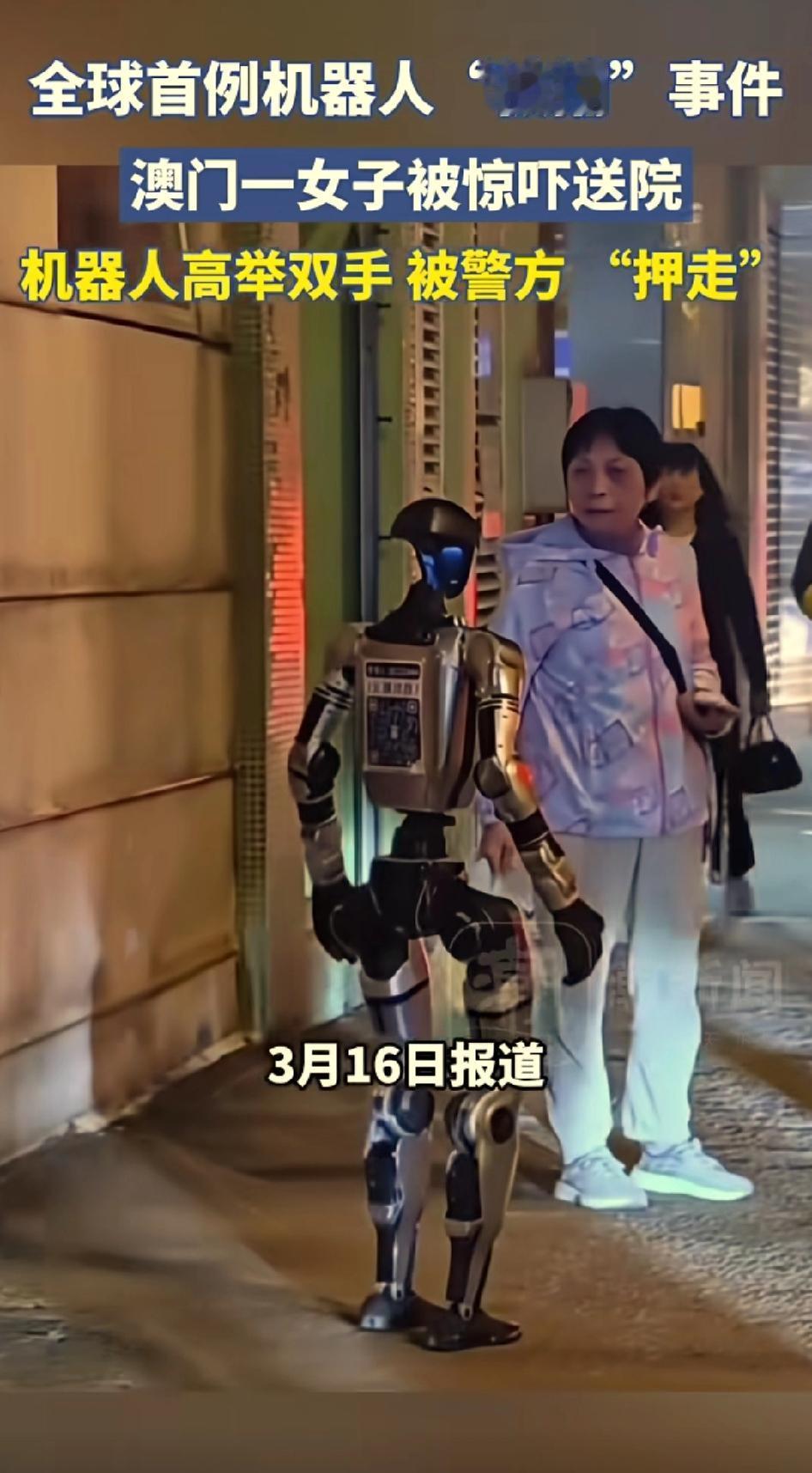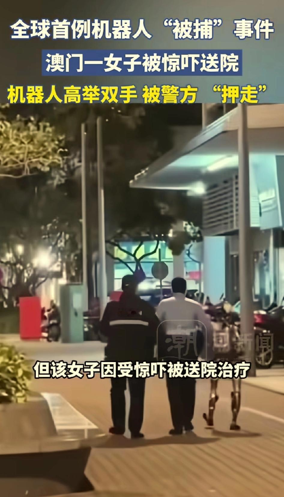 真是笑死了,机器人被警察抓走了?你没有看错,全球首例机器人“被捕”事件,发生在澳门,澳门一名妇女正在打电话的时候,被一个机器人吓了一跳,打电话报警,机器人高举双手被警察“押走”了。那位妇女受到惊吓,送往医院治疗! 以后是不是被机器人吓到了都可以报警啊!