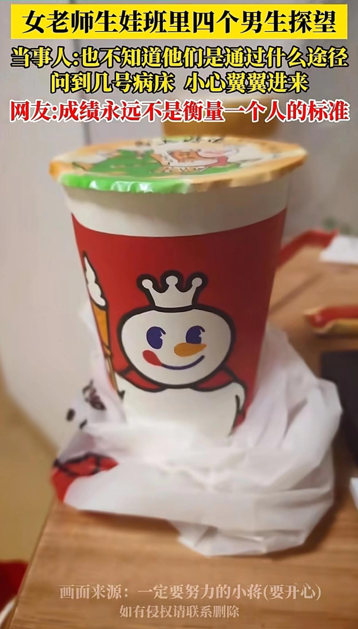 泪目了! 浙江嘉兴,一名女老师怀孕生子后在医院病房休息,没想到,班里四名男生竟然 悄悄找了过来,而这四名男生,既不是班里的干部,也不是学习成绩好的孩子,反倒是平时最不省心的几个,网友:成绩永远不是衡量一个人的标准。 这几个小家伙,在学校调皮捣蛋出了名,学习不拔尖,还常惹事,女老师为他们没少操心。可此刻,他们却小心翼翼地来到病房,用零花钱买了奶茶和水果。 他们为找老师,没惊动家长,一路打听摸到医院,挨个护士站询问找到病房。见到老师,从最初的拘谨,到打开话匣子汇报班级情况,满满的都是对老师的关心。 这一幕,让人不禁思考,什么才是衡量好孩子的标准?成绩并非唯一,老师的耐心与善意,在这些调皮孩子心中生根发芽,才有了这温暖的双向奔赴。你身边有这样暖心的师生故事吗?