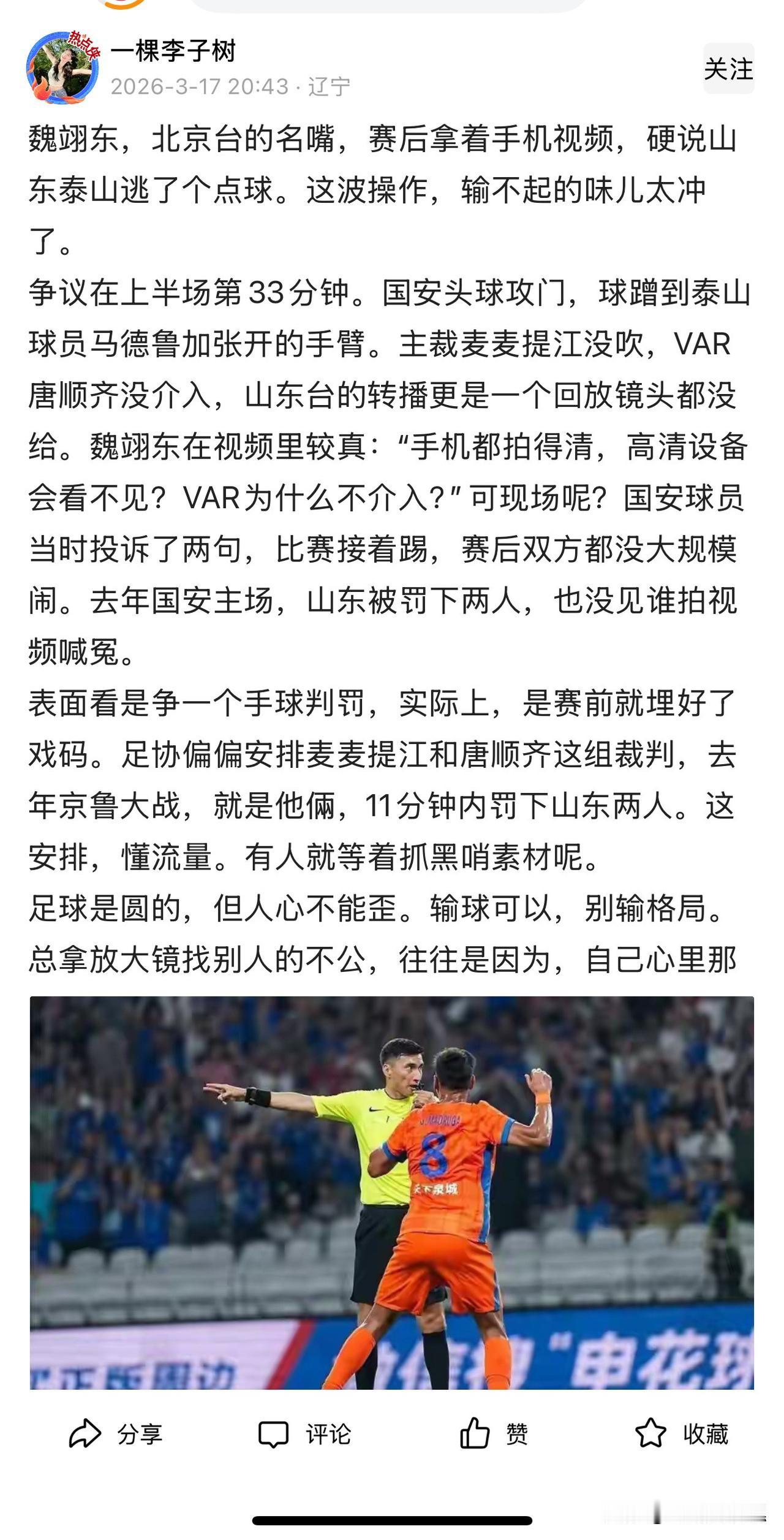 魏翊东,北京台的主持人,每逢国安的比赛,当仁不让的常驻解说。 北京国安的比赛,那些某地的人不看自己省的转播,俩眼儿直眉瞪眼儿的盯着北京台。 作为北京台的主持人,偏向本地主队有什么错?得罪你们了?你们省的比赛转播,北京球迷关注吗?提个问,仅限北京人回答,请问:某省的电视台,足球转播的解说叫什么,北京球迷不可能会知道。更别提他们在转播中是如何置事实不顾的信马由缰了。 举了例子,我这人就喜欢举例子。某人在家里关着门谈论张三,李四悄么叽的去扒窗根儿,然后飞奔到场院、墙根儿、大树底下、老娘们儿堆儿里跟街坊四邻嚼耳朵根儿,啧啧啧啧啧,听说了吗,哎呦喂,就那个谁谁谁,我都不好意思学,哎呀我,我还是说了吧,你们知道吗,就那个谁,在家里说那个谁谁谁呢,背着人议论别人,真不地道,哪像咱们呀,咱们是天底下最耿直的人了。 你说你是什么揍的玩意儿。呵呵 ————————