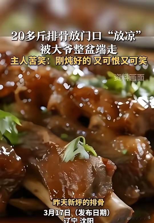 这事的荒唐程度,让人一时不知道是该先心疼那20多斤排骨,还是该佩服这位大爷的心理素质。 3月16日,沈阳。一位开店的张女士炖了40斤排骨,20多斤刚出锅的实在烫得没法立刻进冰箱,就顺手放在店门口晾一晾。就这么一转身的功夫,等她再出来,连盆带肉,干干净净,啥都没剩下。 监控调出来一看,是一位路过的大爷,步伐稳健,动作丝滑,端起来就走,全程没有任何犹豫和慌张,仿佛那本就是他从自家厨房端出来的一样自然。 张女士的反应也真实——又恨又笑。恨的是成本实打实没了,笑的是这人拿东西的姿势实在太理直气壮。最后她还是报了警。 这事在网上传开,评论区几乎是一边倒的“离大谱”。但仔细想想,这真的只是个“贪小便宜”的事儿吗? 先看这个细节——20多斤排骨,连盆端走。那不是一块肉,是一大盆肉。大爷是怎么判断这玩意儿能拿的?如果是一块肉掉地上他捡起来,可能还能用“以为是没人要的”糊弄过去。但一盆刚炖好的、还冒着热气的排骨,整整齐齐摆在店门口,这是什么样的“没人要”? 他比任何人都清楚这不是自己的东西。 但他还是拿了,而且拿得毫无心理负担。这不是一时糊涂,这是一种长期形成的、被默许的行为模式。 在很多人的认知里,只要没被抓现行,就是没发生。只要没人当场喊停,那就是默许。这种逻辑听起来荒谬,但在现实中大量存在。它不是“偷”的概念,而是“捡”的错觉——一种把别人的东西,在没人的时候,默认为可以拿走的思维惯性。 这事还有个细节值得琢磨。张女士是开店的,排骨放在店门口,理论上还在她的管理范围内。但大爷显然不这么认为。他的行为逻辑是:你看不见,那就是无主。我拿走,那就是我的。 这些年类似的新闻太多了——门口晾的腊肉被整串提走,快递暂放一会儿就被拆走,院子里晒的被褥下午收的时候就没了踪影。而且下手的大多是看起来普普通通的中老年人。你说他们缺这点东西吗?不一定。但他们对“拿”这件事的心理阈值,低得惊人。 问题是,谁给他们的底气? 说白了,是长期缺乏后果意识。很多人在小事上占便宜,占了一辈子,从来没付出过什么代价。久而久之,“顺手牵羊”变成了一种自然反应,甚至不觉得自己在犯错。直到监控怼到脸上,才意识到事情大了。 张女士报警是对的。不是为了那20多斤排骨值多少钱,而是要让这种行为有代价。今天端走一盆排骨的是他,明天顺手拎走别人门口东西的可能就是另一个他。如果每一次“顺手”都有后果,这种“丝滑操作”就不会那么丝滑。 也有人会说,老年人嘛,可能一时糊涂,教育一下就行了。问题是,这种“一时糊涂”的选择性太强了。他进超市怎么不糊涂?他知道要付钱。他坐公交怎么不糊涂?他知道要刷卡。偏偏在没人看见的时候,他就突然分不清哪是自己的、哪是别人的了? 这件事说到底,不是什么穷疯了,也不是什么一时冲动,而是一种长期被纵容的边界模糊。很多人在公共空间里,对“别人家的东西”缺乏基本的尊重。不是买不起,是拿习惯了。不是不知道错,是以为没人知道。 现在监控拍得清清楚楚,连盆带肉,动作流畅。希望这位大爷能看到自己这段行云流水的表演,顺便想想——这20多斤排骨,吃下去,到底香不香。