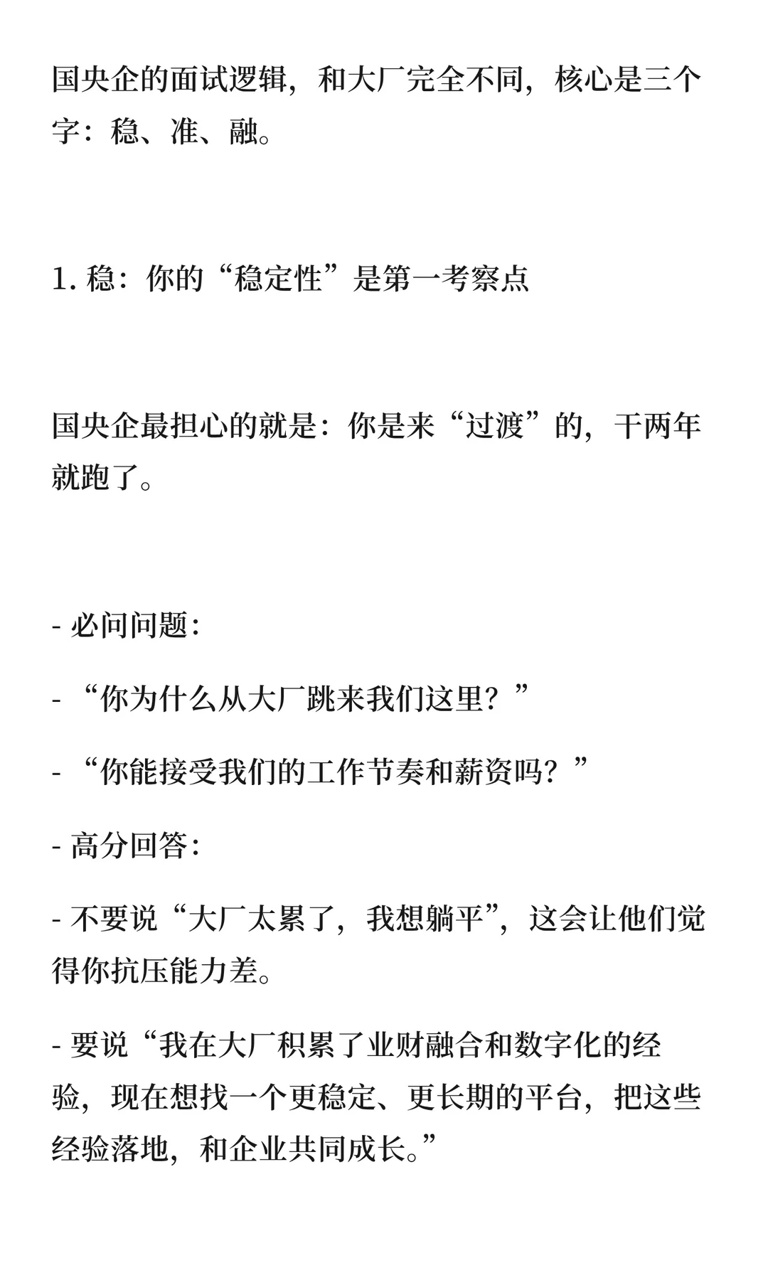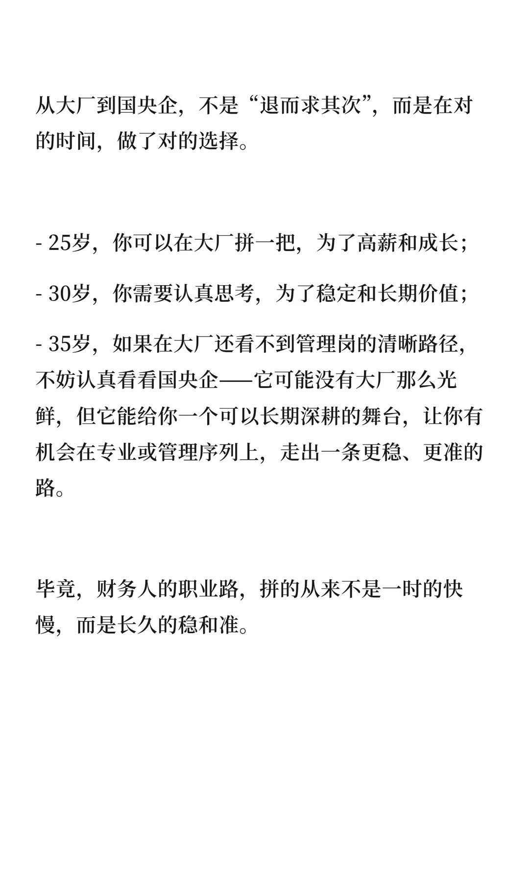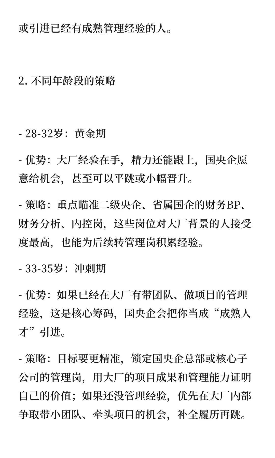 大厂财务人跳槽国央企需调整策略:28-32岁瞄准央企岗位,33-35岁争取管理岗,35岁以上考虑专业岗。面试强调“稳、准、融”,国央企看重稳定性、专业度和融入度。国央企提供长期职业平台,适合积累经验和管理经验。