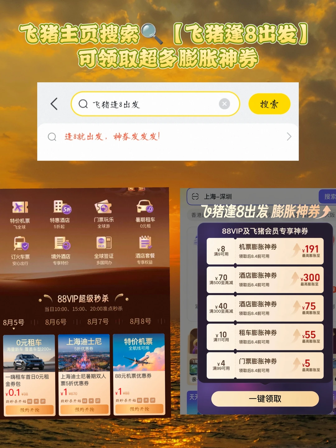 近期刚好有一个飞猪的88vip活动,只要在飞猪上搜索🔍【飞猪逢8出发】,进入活动会场后可以领取很多的大额酒店膨胀券🏨,还有一些其他的丰富权益补贴🌸