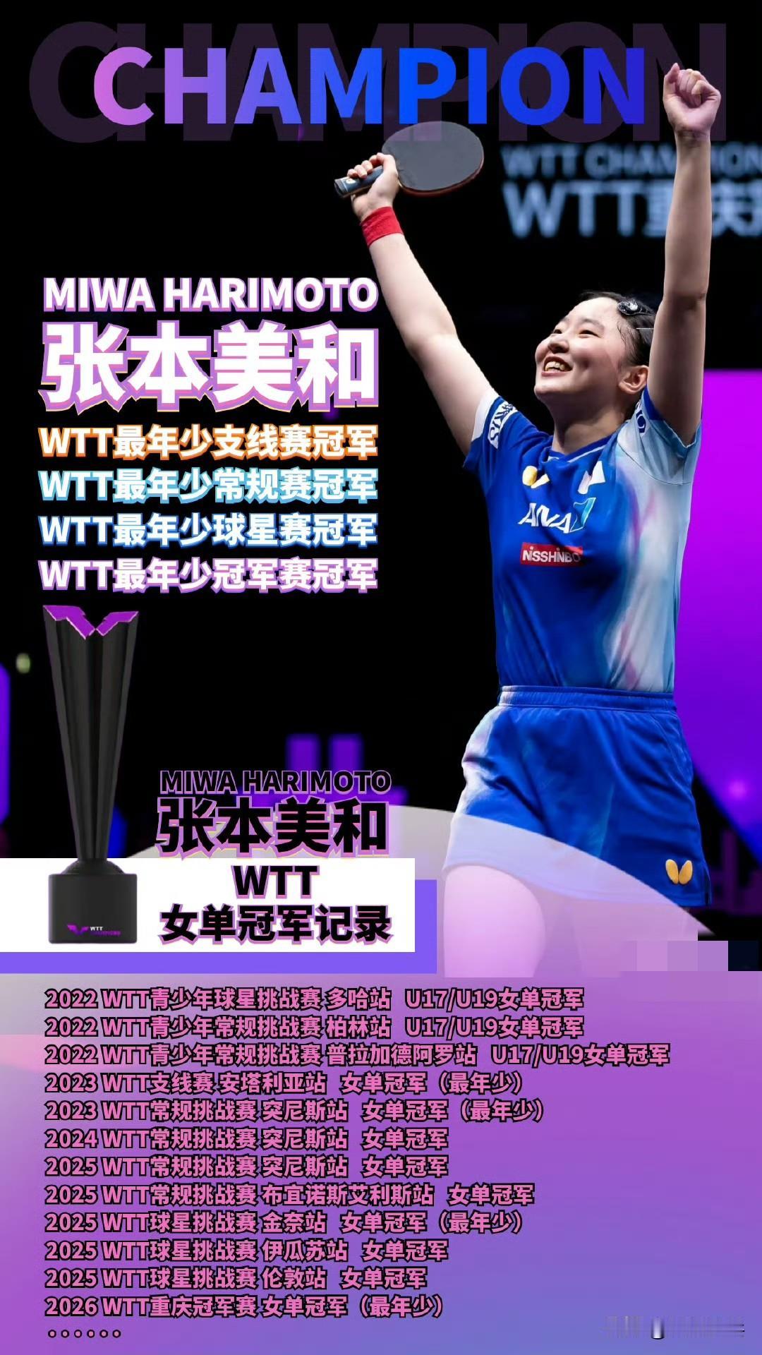 🏓🇯🇵张本美和WTT冠军纪录 WTT最年少支线赛冠军🧡 WTT最年少常规赛冠军🩵 WTT最年少球星赛冠军💙 WTT最年少冠军赛冠军💜 WTT女单冠军记录 2022 WTT青少年球星挑战赛 多哈站 U17/U19女单冠军 2022 WTT青少年常规挑战赛 柏林站 U17/U19女单冠军 2022 WTT青少年常规挑战赛 普拉加德阿罗站 U17/U19女单冠军 2023 WTT支线赛 安塔利亚站 女单冠军(最年少) 2023 WTT常规挑战赛 突尼斯站 女单冠军(最年少) 2024 WTT常规挑战赛 突尼斯站 女单冠军 2025 WTT常规挑战赛 突尼斯站 女单冠军 2025 WTT常规挑战赛 布宜诺斯艾利斯站女单冠军 2025 WTT球星挑战赛 金奈站 女单冠军 (最年少) 2025 WTT球星挑战赛 伊瓜苏站 女单冠军 2025 WTT球星挑战赛 伦敦站 女单冠军 2026 WTT重庆冠军赛 女单冠军 (最年少) 注:张本美和是2008年出生的。最新一期世界乒坛排名第五(截至2026.3.16),2026年全日锦四冠王。 2026.3.17