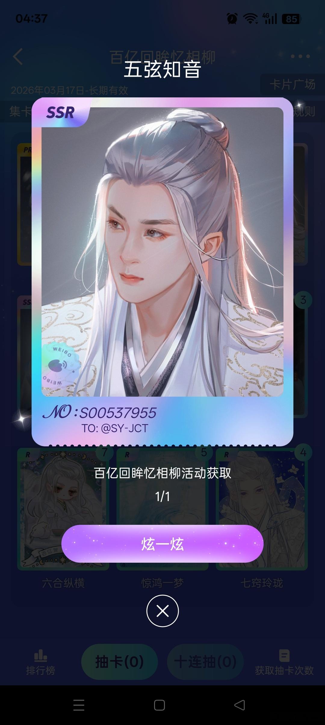 檀健次 哇😯!今天也手气不错啊!又抽到一张SSR卡,还有最后一张就集齐了!继续加油!