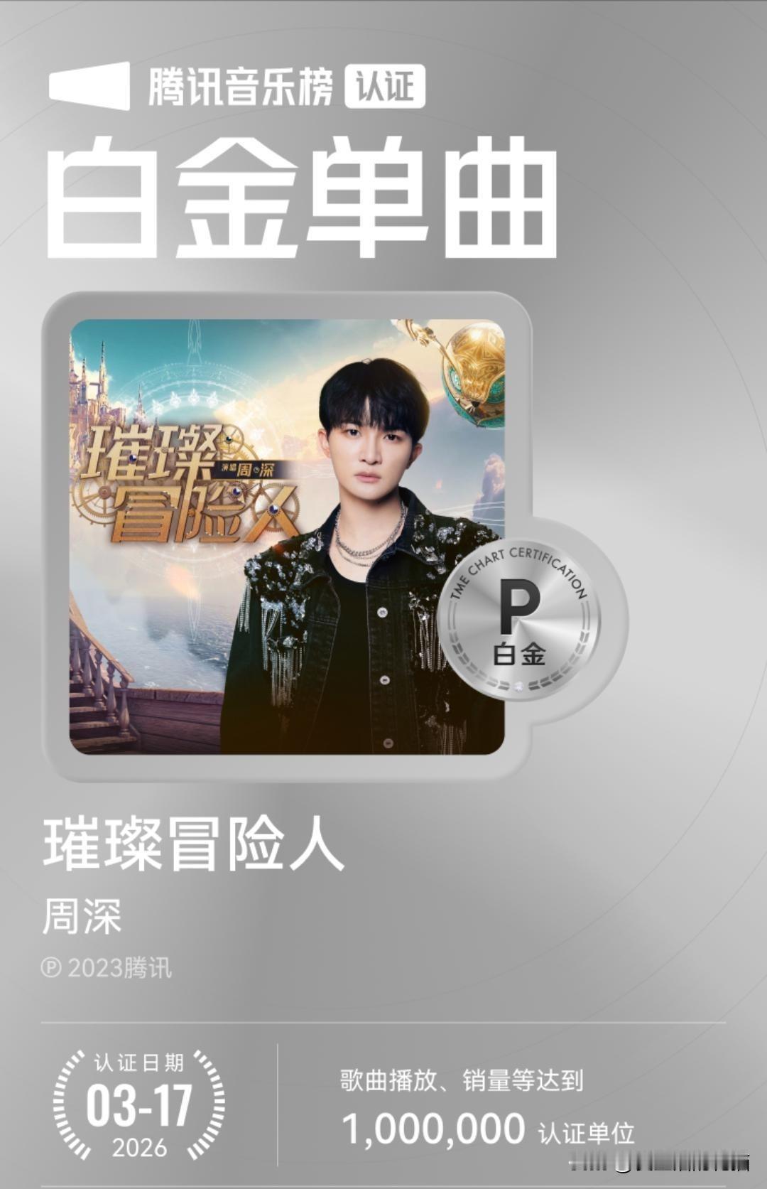恭喜周深!《璀璨冒险人》升级为腾讯音乐榜白金单曲啦! 这个白金单曲意味着这首歌在播放量、销量、还有由你推荐这些维度上,累计冲破了1,000,000的认证单位。 在这个新歌层出不穷的年代,一首歌能达到这个量级,真的是硬实力的证明了。 《璀璨冒险人》这首歌本身就带着一种“向上生长”的力量,深深的声音一出来,就让人感觉像是在黑暗中看到了一束光。 现在这首歌被这么多听众认可!截止到现在,周深个人的累计认证单位已经达到了25,500,000个! 这一路走来,他真是在用作品一点一点搭建自己的音乐王国。时间过得真快,他也走得真稳。 好歌值得被听见,好声音值得被记住。再次恭喜深深!