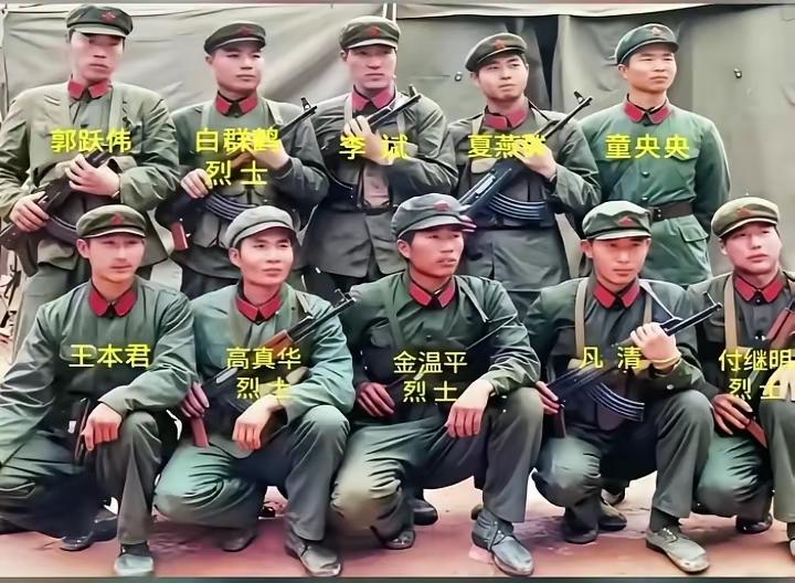 1984年12月,原南京军区陆军第一军第一师三团特务连侦察六班在老山前线留下出征留影。照片中有侦察排长童央央在内,共10人。 1985年1月15日,由10位安徽籍战士组成的“安徽班”,在收复116高地战斗中,摧毁敌军火力点18个,将守敌加强排全部歼灭,荣立集体一等功。2月1日“140高地”战斗,他们作为“第一突击队”参战,9位勇士中有4位壮烈牺牲。 出征前,家乡父老寄来慰问品与家书,有的战士未婚妻绣鞋垫予以鼓励,父亲也支持儿子为国效力。这些英雄值得永远铭记,向他们致敬!