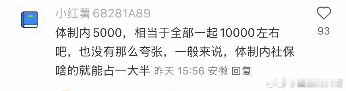好好 1 2026-03-18 15:16 我就是体制内的,我告诉你,体制内5000就是等于体制外5000,而且我还告诉你县城里体制内的年轻人5000都没有,我最多一个月3300 用户10xxx62 回复 03-18 21:15 保险买的高,公积金买的高,节日奖金,年终奖等这些算上,年到手比体制外同样月薪的多不少