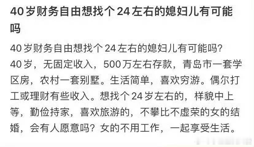 40岁财务自由想找个24左右的媳妇儿有可能吗 ?