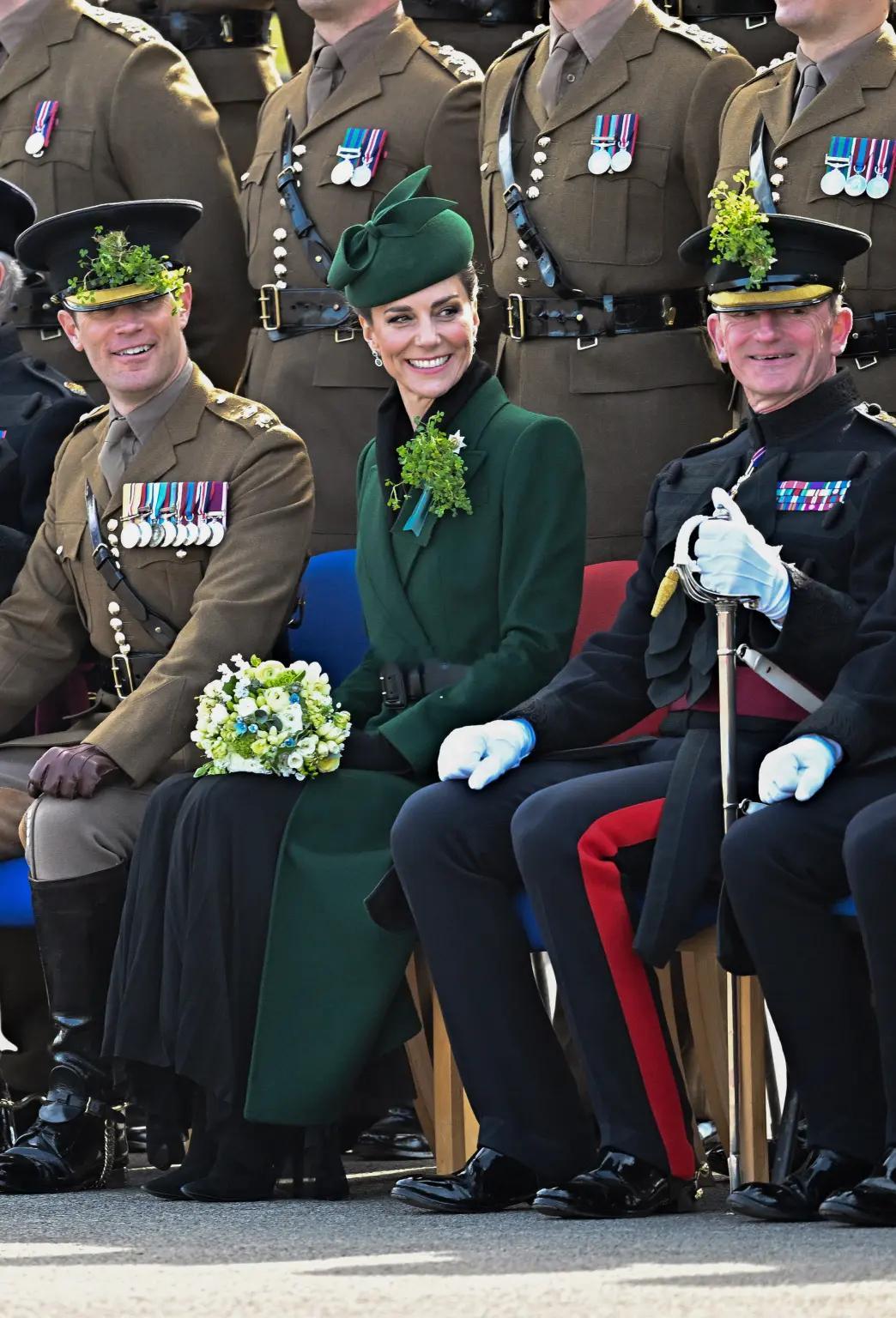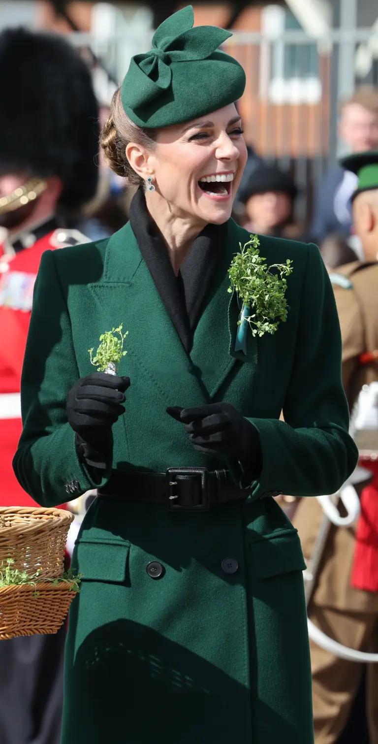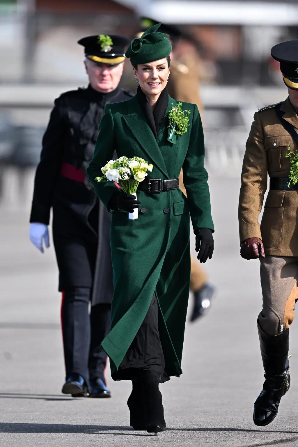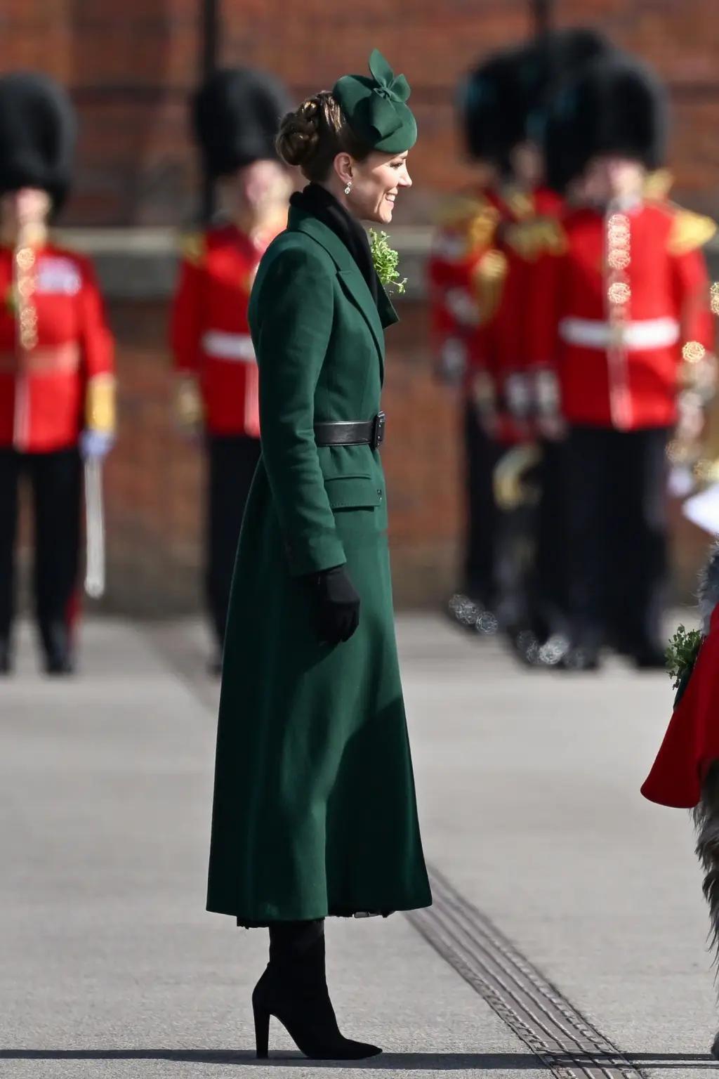 定制的Alexander McQueen双排扣大衣➕Gina Foster Millinery的绿色礼帽➕Asprey London 祖母绿钻石耳环➕Cornelia James手套➕Ralph Lauren及膝麂皮长靴👢