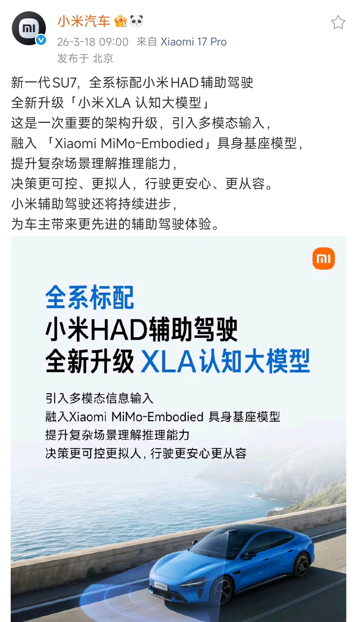 小米新SU7辅助驾驶升级XLA大模型 小米XLA是小米汽车自研的智驾专属认知大模型架构,引入激光雷达、摄像头等多模态传感器数据输入,还融入Xiaomi MiMo-Embodied具身基座模型,实现感知、推理、决策、控制的端到端统一,让车辆真正实现类人思考。