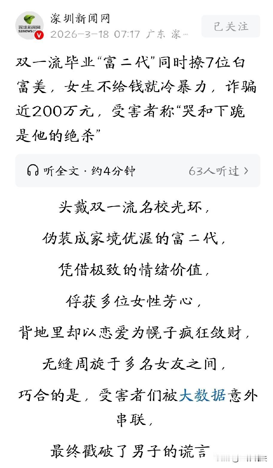 这就是恋爱脑的下场!上海,双一流毕业的男子,不想着好好找份工作赚钱,反而借网贷租豪车,给自己树立“富二代”的人设,通过甜言蜜语提供情绪价值,骗财骗色。女友两年时间给男子花费122万后,实在痛苦不堪,只能通过社交平台发泄心中的压力。没想到,这一动态引起男子的另外两名女友的注意,三人一聊才发现被骗。报警后,经过民警的调查,男子竟然同时和7个女友谈恋爱,真相令人咋舌。 看到张女士的一条动态,三个女人因为同一个男人坐到了一起,她们互相确认恋爱时间线后才发现,这个叫李某的男人,竟然同时跟她们三个人保持着恋爱关系。 更让她们崩溃的是,她们还都被这个男人骗走了不少钱。 1999年出生的李某,毕业于上海一所双一流高校,学的是英语专业。 按说这个学历找个正经工作不难,可李某毕业后根本没想着上班,反而打起了歪主意,他想靠谈恋爱骗钱。 为了能骗到条件好的女孩,李某给自己打造了一个“富二代”的人设。他租了好几辆豪车,把自己包装成创业青年,开着豪车出入高档场所。 重点是李某还特别会说话,跟女生相处时总能投其所好,捕捉对方的喜好,给对方提供所谓的情绪价值。 张女士是个性格比较内向的富家女,从小父母管的紧,突然遇到李某这样体贴的男人,她很快就陷进去了。 确定恋爱关系后,李某开始露出真面目,不是生意周转需要钱,就是说创业缺资金,要么就画大饼说以后带她过好日子。 张女士被爱情冲昏了头,为了满足李某的索求,她从月租15000元的公寓搬到了月租2500元的合租房,还把她的名牌包和衣服都卖了给男友凑钱。 每次李某要钱她都给,实在没钱了就去借。 两年下来,张女士前前后后给了李某122万,其中不少是找亲戚朋友借的,她的积蓄和零花钱早已被李某压榨的一干二净。 这期间,张女士不是没想过分手,但李某对她时好时坏,要钱的时候嘴甜得很,给完钱就不理人。 每次张女士提分手,李某就跪下来哭,还甜言蜜语哄着说爱她,以后一定会娶她。 看着一个大男人跪在地上哭,张女士心一软,又被哄好了。 这段感情持续了两年,张女士实在受不了了,在社交平台上发了条动态发泄情绪。这条动态被刘女士刷到了。 刘女士一看内容,觉得跟自己遇到的情况一模一样,马上私信联系,打算吐槽一下她们的悲惨经历。 不聊不知道,两人一对时间线,才发现她们的男友竟然是同一个人,李某同时在跟她们两个人谈恋爱。 这两年时间里,李某靠着一只小狗维系两段感情。两个女人都以为那只狗是她们跟李某的爱情见证,其实李某把同样的套路用在了两个人身上。 更巧的是,还有个林女士也通过社交平台联系上她们。林女士说自己也被同一个男人骗过钱。三个人一碰,发现李某跟她们交往的时间段都是重合的。 警方接到报警后调查发现,李某同时交往的女友远不止这三个,他同时和7个女友交往。 李某的女友年龄从19岁到30岁不等,有在校大学生,也有上班族,都是家境不错、性格单纯的女孩,而且都被李某骗了不少钱,累计下来有200多万。 面对警察,李某还在狡辩,一口咬定张女士和刘女士的钱都是他借的,并没有骗,还声称愿意打欠条还钱。 但是李某根本没有工作,也没有收入,还欠了一屁股网贷,所谓的那些生意、富二代身份全是假冒的,这不是诈骗是什么? 目前,李某因涉嫌诈骗罪已经被检察机关批准逮捕,案件还在进一步办理中。 那些被他骗的女孩,不知道要多久才能从这场骗局里走出来。 《刑法》第266条规定:诈骗公私财物,数额较大的,处三年以下有期徒刑、拘役或者管制,并处或者单处罚金。 李某以非法占有为目的,虚构“富二代”“创业青年”身份,租豪车包装人设,以“生意周转”等虚假理由多次向被害人索财,同时与7人恋爱掩盖真相。 这样的行为属于虚构事实、隐瞒真相,使被害人陷入错误认识并自愿处分财产,累计损失超200万元,属数额特别巨大 ,符合诈骗罪构成要件。 因此,李某面临的必将是刑事处罚,还要依法退赔张女士等人的财物。 只是这些钱财被他挥霍了不少,至于能退还多少,还是个未知数。 对此你怎么看?