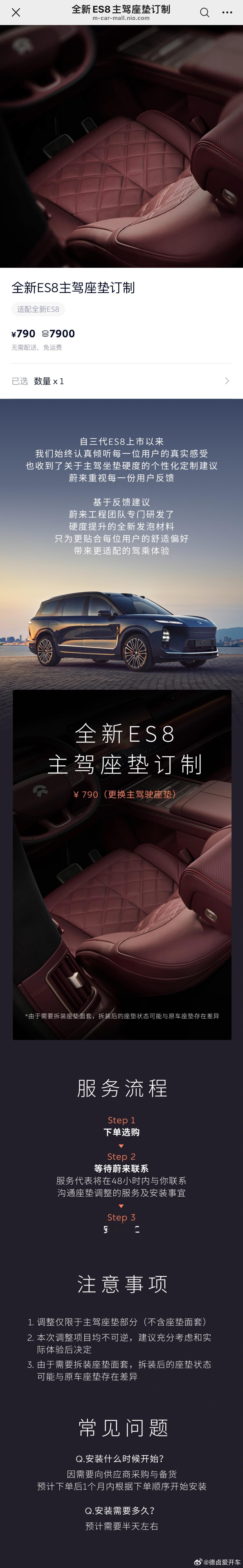 蔚来为部分全新ES8用户推出主驾座垫海绵订制更换服务,该方案价格790元/7900积分。