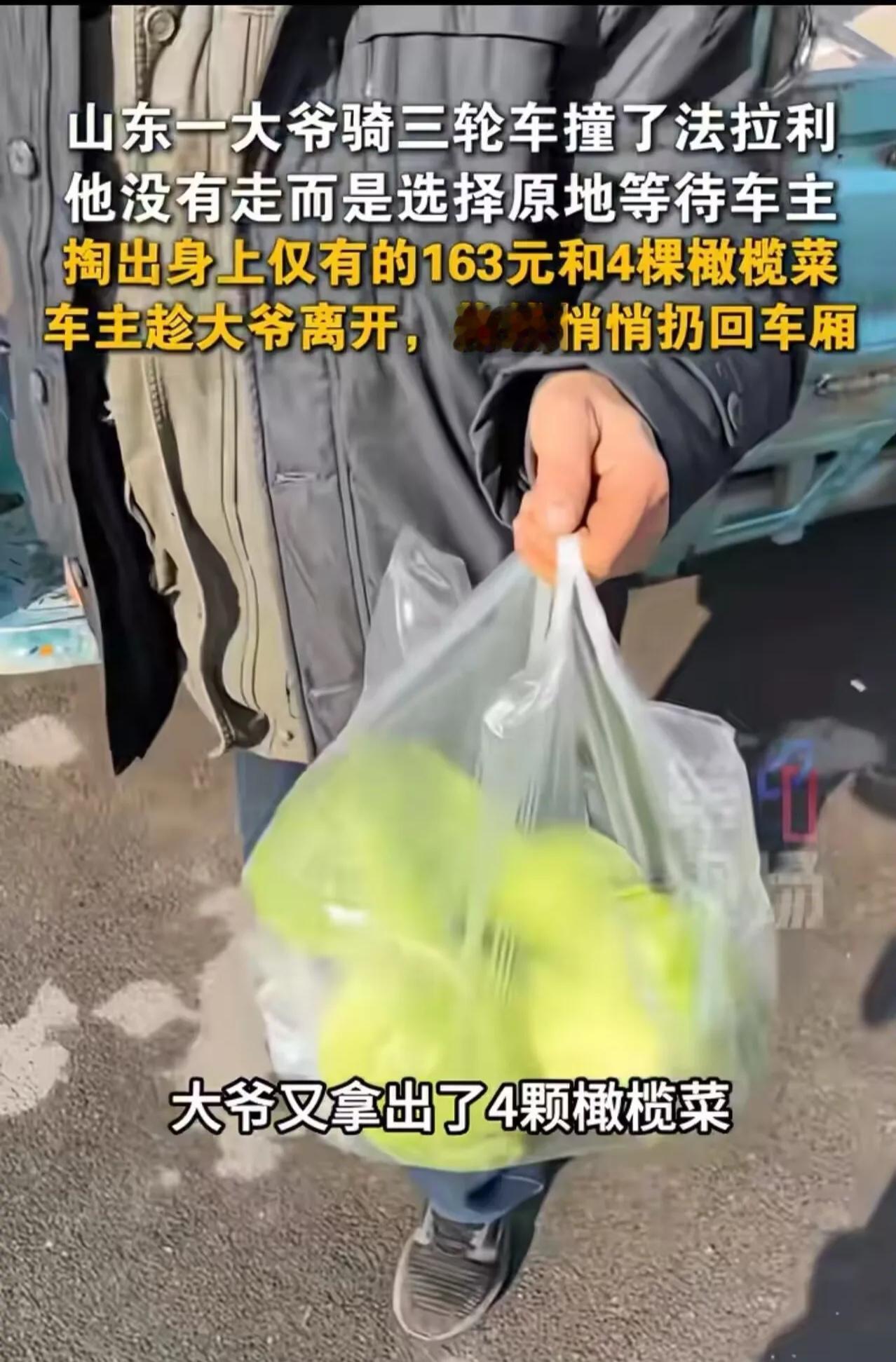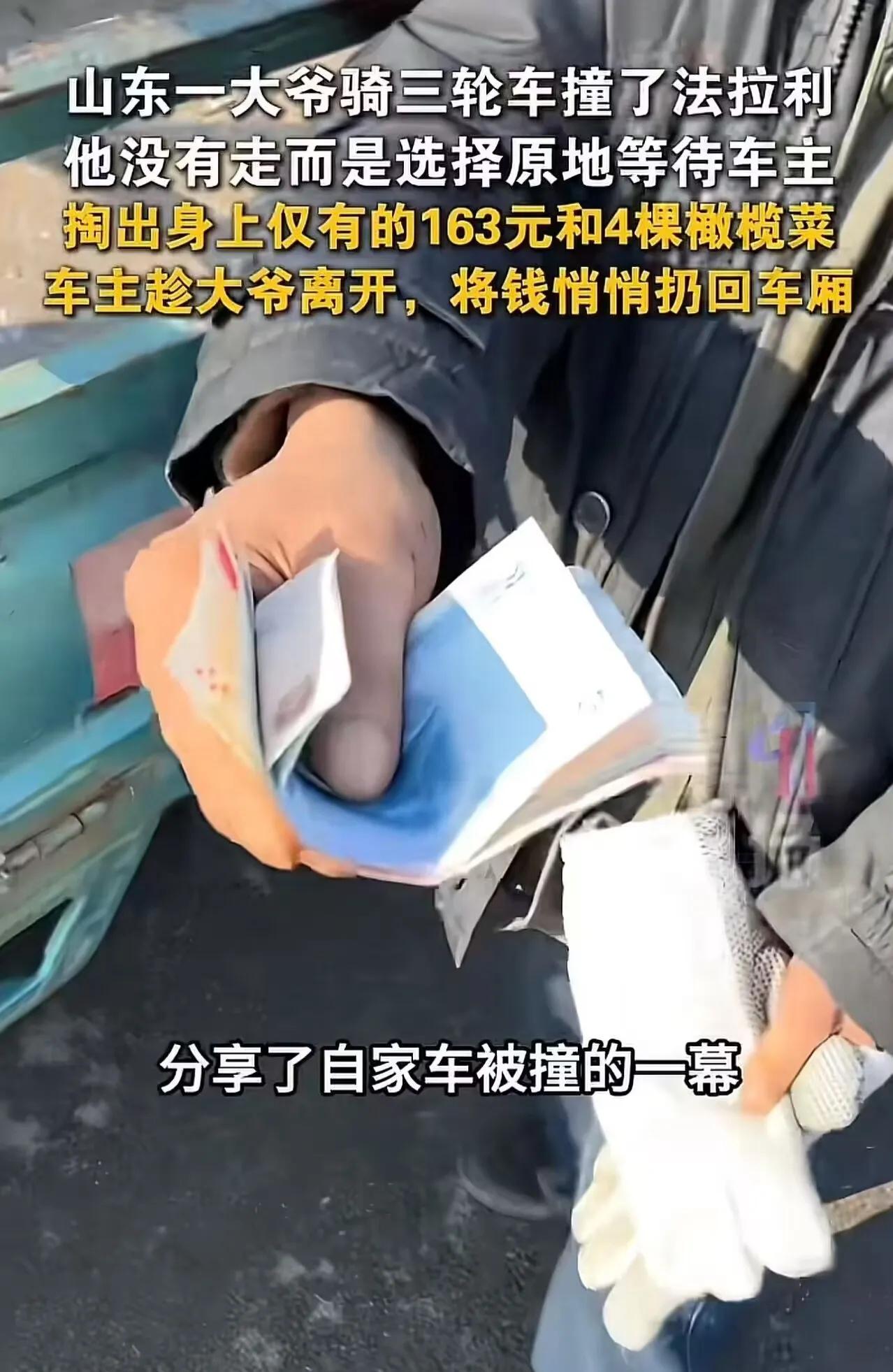 “我赔你,就这些了!”山东一大爷骑三轮车撞了法拉利,他没有跑,掏遍全身凑出163块钱,外加刚从集市上买的4棵橄榄菜,全塞给了车主。可接下来的一幕,让所有人都沉默了。 这位大爷头发花白,穿着一件洗得发白的旧棉袄,骑着那辆除了铃铛不响哪儿都响的三轮车,正慢悠悠地往家赶。不知道是路滑还是眼神不好,只听“哐当”一声闷响,三轮车结结实实地怼上了一辆停在路边的红色跑车。 大爷当时心里咯噔一下,赶紧下车查看。他虽然不认识这是什么车,但看到那流线型的车身和锃亮的漆面,也知道这不是普通人家买得起的。换成别人,可能瞅瞅没人就溜了。可大爷没有,他把三轮车支好,就站在寒风里,等着车主回来。 这一等,就是半个多小时。 车主终于来了,是个年轻小伙子。他看到自己爱车保险杠上那道刺眼的划痕,眉头一下子就皱了起来。还没等开口,大爷就颤颤巍巍地走过来,满脸愧疚:“孩子,对不起啊!是我撞的,我眼神不好,没瞅见。我寻思着不能走,就在这儿等你回来。” 小伙子刚想问问这车怎么赔,就见大爷开始在身上摸索。他从怀里掏出一个皱巴巴的手绢,一层一层地打开,里面是些零钱,最大的一张是20块的,剩下的全是5块、1块的毛票。大爷数了数,一共163块,一把塞到小伙子手里:“我就这些钱了,都给你,修车。” 小伙子愣住了,看着手里这堆还带着体温的零钱,再看看大爷那件破旧的棉袄,到嘴边的话又咽了回去。这163块钱,别说修法拉利了,可能连洗个车都不够。 大爷见他不说话,以为嫌少,急得眼圈都红了。他突然想起什么,转身跑到三轮车旁,从车斗里捧出几棵还带着泥的橄榄菜,又递到小伙子面前:“那……那我把这个也给你。我就这些了,真就这些了。” 163块钱,加4棵刚从集市上买的橄榄菜。这就是一个老人身上所有的东西。 小伙子看着大爷那双粗糙的手,还有手心里那几棵沾着泥土的菜,眼眶一下子热了。他深吸一口气,尽量让语气平和下来:“大爷,您知道这车多少钱吗?” 大爷摇摇头,一脸迷茫。 “这车好几百万,修一下得好几万。您这钱……确实不够。” 大爷一听,整个人像被雷劈了一样,脸瞬间煞白,腿也开始哆嗦。好几万?把他卖了也赔不起啊! 可小伙子接下来的动作,让大爷完全没想到。他把钱和菜都接了过来,郑重地点点头:“行,大爷,钱我收了,菜我也收了。这事就过去了,您别往心里去。以后骑车慢点,注意安全。” 大爷千恩万谢,推着三轮车慢慢离开,背影在寒风中显得格外佝偻。 而小伙子站在原地,看着大爷走远,悄悄走到三轮车旁,趁大爷不注意,把那163块钱又塞回了他的车斗角落里。然后他转身回到自己车上,盯着那道划痕看了很久,最后发动车子,缓缓驶离。 这一幕被路人拍下来发到网上,很快就火了。有网友评论说:“大爷掏出的不只是163块钱,那是他作为一个普通人的全部尊严。小伙子收下又还回去,是给这份尊严最好的体面。” 说实话,大爷的做法让人心疼,但也让人敬佩。他穷,但他知道什么叫责任,什么叫担当。撞了东西要赔,赔不起也要拿出全部家当,这就是一个普通中国人骨子里的那份朴实和厚道。而那个开法拉利的小伙子,更让人感动。他完全可以让大爷走法律程序,按规矩赔偿,几万块钱的修车费,能压垮一个农村老人。但他选择了善意,用一种不动声色的方式,保全了一个老人的尊严。 这个故事之所以能打动人,就是因为它让我们看到:无论有钱没钱,真诚和善良,才是人身上最值钱的东西。大爷的163块钱,比很多人的万贯家财都重;小伙子的那一次“悄悄归还”,比任何豪车都更让人记住他。 (信息来源:根据网络媒体报道综合整理)