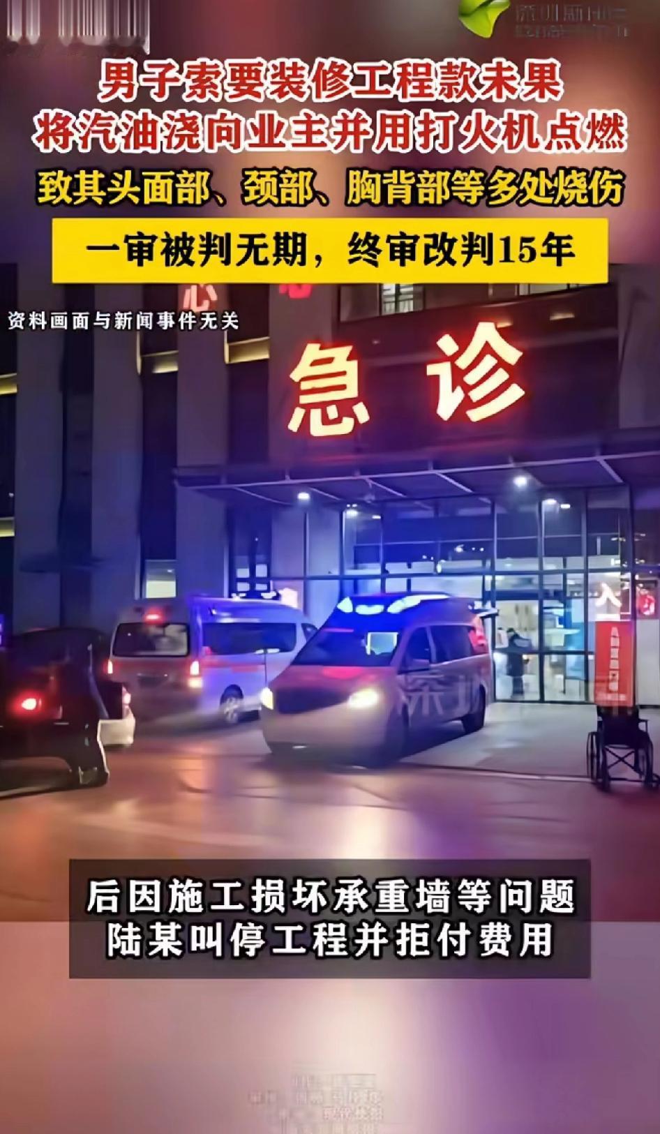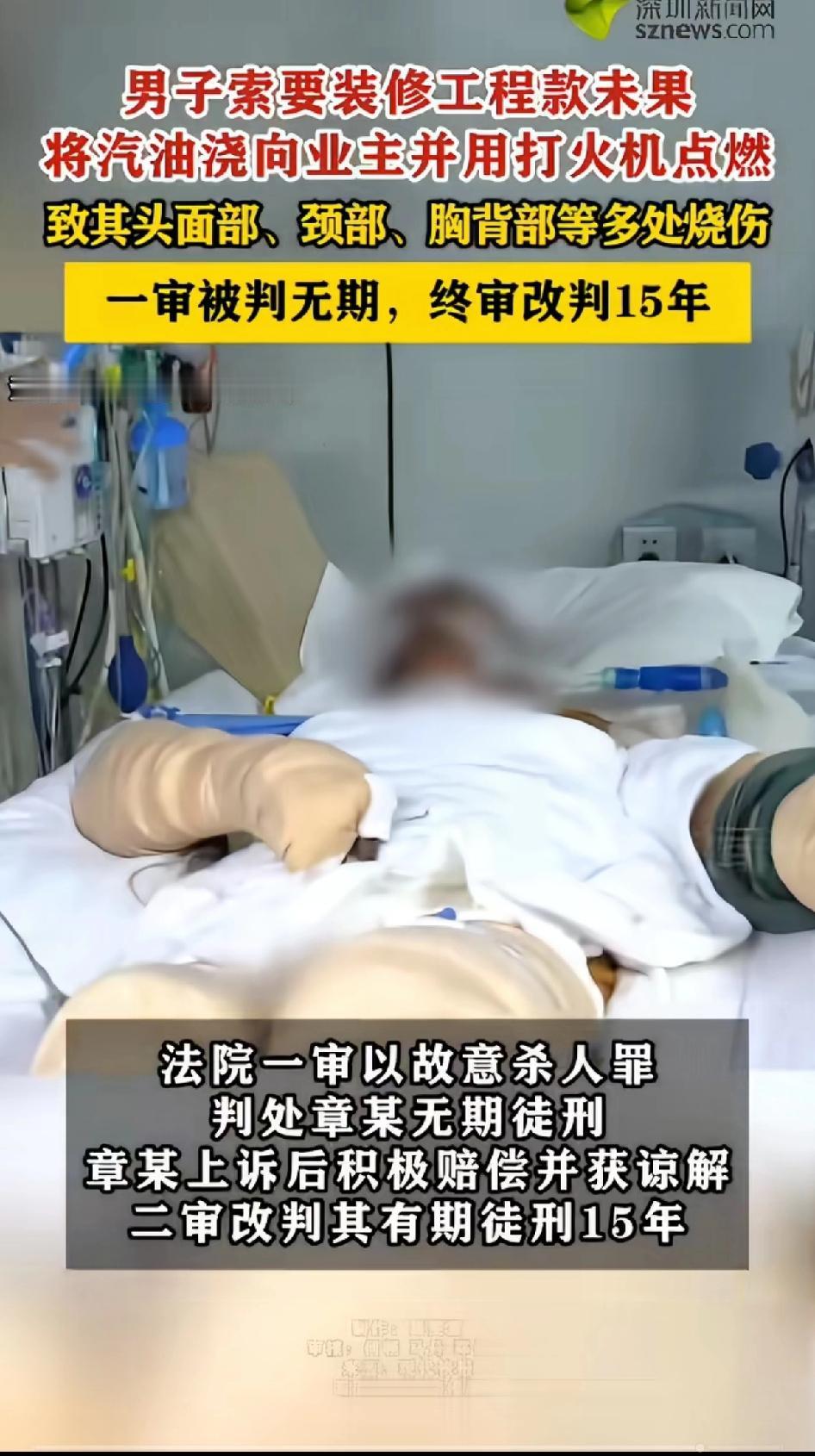 男子索要装修工程款未果,将汽油泼向业主并用打火机点燃,致其头部、胸背部、颈部等多处烧伤。一审章某以故意杀人罪被判无期,章某上诉并积极赔偿受害人并获得原谅,二审改判有期徒刑15年。 内蒙古这起装修工程款引发的悲剧太让人唏嘘。2024年4月,陆某把拆墙工程口头交给章某,连书面协议都没签。章某施工时没保护地板,还损坏了承重墙,陆某叫停工程。章某多次索要费用,陆某却不解决也不支付。 到了12月30日,章某冲动之下,在诊所向陆某泼汽油并点燃,导致陆某重伤,自己也被烧伤。最终,章某被判15年。冲动是魔鬼,不但害了别人还害了自己。 这真是害人害己,本来可以通过合法途径解决问题,却选择了最愚蠢的方式,不仅毁了自己,也毁了别人的生活。合作还是得签好协议,遇到纠纷理性解决啊。