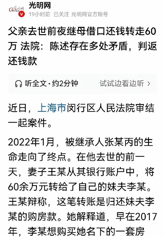 没人味了!上海,男子躺在医院的病床上,已经意识不清,生命已走到了尽头,他的二婚妻子却背着他,偷偷把60多万转给了自己的亲妹夫。第2天,男子去世,他和前妻生的一儿一女,发现父亲账户里所有的钱都被转空,认定是继母趁父亲病危转移财产,将继母告上法庭,要求返还兄妹该继承的份额,法院这样判! 上海老小区的巷口,张某裹着外套,低着头想偷偷溜进楼道。 刚走到单元门口,就被围上来的街坊堵住,议论声此起彼伏。 “就是她,趁老伴快不行了,偷偷转走60多万,太凉薄了!” “赢了官司还想躲?欠的良心债,这辈子都还不清!” 张某脸色煞白,双手紧紧攥着衣角,恨不得找个地缝钻进去。 没人会同情她,这场围堵,不过是她贪婪换来的必然结果。 没人知道,半年前,她还是街坊眼里“贴心照料老伴”的好妻子。 那时,老陈突发脑溢血,被紧急送进医院,抢救了三天三夜。 老陈是个老实本分的工人,退休后靠着退休金和积蓄,日子还算安稳。 他与前妻离婚后,独自抚养儿女长大,后来经人介绍认识了张某。 两人结婚五年,没什么轰轰烈烈的感情,却也相安无事。 老陈的儿女各自成家,平日里忙于工作,只能时常来看望父亲。 老陈病重后,儿女们轮流请假陪护,可终究抵不过工作的忙碌。 张某主动提出,由她全天守在医院照料,让儿女们放心去上班。 老陈的儿女十分感动,觉得父亲晚年能有这样的伴侣,是种福气。 他们不仅给张某留了生活费,还时常给她买补品,对她百般感激。 可他们万万没想到,这份信任,最终变成了刺向自己的利刃。 老陈病情反复,渐渐失去意识,只能靠呼吸机维持生命。 张某看着病床上毫无反应的老陈,心里没有担忧,只有算计。 她想起老陈曾跟她说过,卡里有60多万积蓄,是养老和应急用的。 一个可怕的念头在她心里滋生:趁老陈还没咽气,把钱转走。 她趁着儿女们不在,偷偷翻出老陈的钱包,找到了银行卡。 又借着给老陈擦手的机会,反复试探,记下了银行卡密码。 为了不被发现,她特意等到深夜,病房里只剩下值班护士。 她躲在病房角落,压低手机亮度,快速操作银行APP。 分两笔,将60多万全部转到了自己妹夫的账户,还删除了转账记录。 她甚至特意给妹夫发了条消息,让他暂时不要动用这笔钱。 做完这一切,她回到病床前,装作一脸关切地看着老陈。 可她的眼神里,藏不住的得意,早已暴露了她的心思。 仅仅过了一天,老陈就因抢救无效去世,儿女们悲痛万分。 他们一边忙着处理父亲的后事,一边想着取出父亲的积蓄办葬礼。 可当他们拿着银行卡去银行查询时,屏幕上的余额让两人瞬间崩溃。 0.00元,一辈子的积蓄,竟然一夜之间消失得无影无踪。 兄妹俩第一时间想到了张某,可看着她悲伤的模样,又有些犹豫。 直到葬礼结束,张某依旧绝口不提存款的事,兄妹俩才下定决心质问。 面对质问,张某没有慌乱太久,很快就编出了一套说辞。 她说老陈生前向妹夫借了60万,用于装修房子,这笔钱是还债的。 还拿出一张模糊的装修收据,企图蒙混过关,证明自己所言非虚。 可兄妹俩一眼就看出了破绽,父亲的房子是多年前装修的,根本不需要借钱。 更重要的是,没有借条、没有转账记录,仅凭一张收据,根本站不住脚。 兄妹俩没有跟她过多纠缠,直接收集证据,向法院提起了诉讼。 他们聘请了律师,调取了银行流水、医院病历、病房监控等所有证据。 证据清晰地显示,转账当天,操作手机的正是张某,且老陈当时已无意识。 一审法院依法判决,认定张某恶意转移婚内共同财产,侵犯子女继承权。 判决张某返还兄妹俩应继承的15万余元,其余部分归张某所有。 张某不服,觉得自己只是“替夫还债”,当庭提起上诉。 她以为二审能翻盘,却没想到,法官驳回了她的上诉,维持原判。 判决生效后,张某依旧拒不还钱,还偷偷转移自己的私人财产。 兄妹俩无奈,只能向法院申请强制执行,查封了她的房产和存款。 直到房产被查封,张某才慌了神,连忙凑钱返还了钱款。 可她的贪婪,早已被街坊邻里知晓,名声彻底毁了。 如今,老陈的儿女拿回了属于自己的遗产,给父亲重新修缮了墓碑。 而张某,成了整个小区的“名人”,走到哪里都被人指指点点。 每天只能躲在家里,看着空荡荡的房子,悔恨自己当初的贪婪。 一场贪婪的算计,毁掉了她的名声,也毁掉了自己的晚年生活。 这世间,最不可取的就是贪婪,最经不起考验的就是人心。 夫妻一场,本该相互扶持、彼此善待,而非趁人之危、算计不休。 张某用自己的经历警示世人,君子爱财取之有道,否则终会自食恶果。 信源:光明网