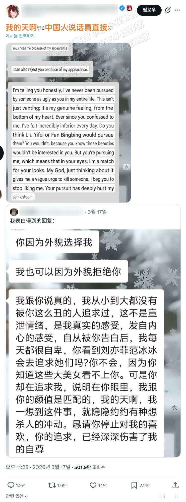 中国女性的拒绝告白短信在海外推特上引发热议。海外新鲜事热点现场 韩国人:“起码他们那至少还可以说出来,在韩国是会被杀的”