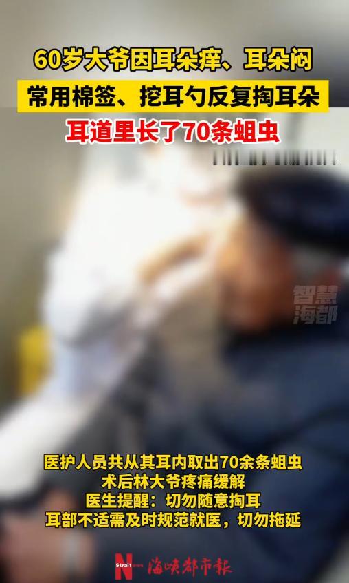 “太吓人了!”福建福州,一位六旬大爷时常觉得耳朵又闷又痒,于是没事就拿挖耳勺掏耳朵,可没想到,耳朵越来越难受,一股怪味怎么也散不掉,去医院一查,耳道里竟然密密麻麻爬满了蛆虫,足足有70多条!网友:这是把耳朵当培养皿了吗? 福建福州的一家医院里,一场令人头皮发麻的治疗正在进行。医生握着专业器械,小心翼翼地从一位六旬大爷的右耳里夹出一条条蠕动的小东西,在场的医护人员都忍不住皱紧了眉头。 整整一个多小时,清点下来,这些白色的蛆虫足足有70多条,密密麻麻的样子,光是想想就让人浑身发毛。 没人能想到,这位看上去精神还算不错的大爷,耳朵里竟然藏着这样一个“恐怖隐患”。而这一切的源头,只是大爷平日里一个再普通不过的小动作——掏耳朵。 大爷常年在田间劳作,风吹日晒是常态,耳朵里偶尔进点灰尘、沾点污物也是常有的事。大概半个多月前,他开始觉得右耳有些不对劲,总感觉闷闷的,像塞了一团棉花,时不时还会发痒,越挠越舒服,却也越挠越痒。 起初,大爷没太当回事,觉得就是普通的耳朵脏了。他像往常一样,随手拿起家里的挖耳勺,没事就掏一掏,有时候看电视、歇着的时候,掏耳朵甚至成了他的一个习惯。他总觉得,只要把耳朵里的“脏东西”掏干净,闷痒的感觉就会消失。 可事与愿违,越掏,耳朵里的不适感就越强烈。原本只是轻微的闷痒,慢慢变成了持续性的胀痛,有时候晚上睡觉都会被疼醒。 更让人难以忍受的是,耳朵里开始散发出一股奇怪的臭味,臭中带着点腐烂的味道,不管怎么清洁,那股味都挥之不去,连家人都能闻到,让大爷十分尴尬。 就这样煎熬了几天,大爷的耳朵疼得越来越厉害,甚至开始流血,连听声音都变得模糊不清,实在扛不住了,家人才赶紧送他去了医院。 接诊的医生用耳内镜一检查,瞬间就发现了问题的根源——大爷的外耳道和中耳里,已经被密密麻麻的蛆虫占满了,周围还有不少脓性分泌物和病变的肉芽,耳道皮肤也被破坏得不成样子。 医生后来解释,大爷常年在田间劳作,耳道容易沾染污物,本身就有轻微的耳部炎症,只是他自己没察觉。 而他频繁用挖耳勺掏耳朵,很容易把耳道皮肤戳破,形成细小的伤口,再加上耳道本身阴暗、潮湿、封闭的环境,刚好给蝇类产卵提供了绝佳的条件,蝇卵在耳道里孵化后,就长成了这些蛆虫。 很多人都有掏耳朵的习惯,觉得掏耳朵是讲卫生的表现,却不知道,我们耳朵里的“耳屎”,其实是保护耳道的“天然屏障”,能润滑耳道、挡住灰尘和细菌,还能抑制有害细菌繁殖。 而且健康人的耳道自带“自我清洁系统”,说话、咀嚼的时候,下颌关节的活动会把耳屎慢慢推向耳道口,自然脱落,根本不需要刻意去掏。 像大爷这样频繁用挖耳勺掏耳朵,不仅会破坏耳道的天然保护层,还容易戳伤耳道皮肤和鼓膜,引发感染。 尤其是户外工作者,耳道更容易沾染污物,一旦皮肤破损,就很容易引发各种耳部问题,严重的甚至会像大爷这样,让耳道变成蛆虫的“温床”。 经过医生的专业治疗,大爷耳朵里的蛆虫被全部清理干净,炎症也得到了控制,术后他的疼痛感瞬间缓解,也终于摆脱了那股难闻的怪味。 只是一想到自己耳朵里曾经爬满了70多条蛆虫,大爷就一阵后怕,连连说以后再也不敢随便掏耳朵了。 其实生活中,很多人都有不当掏耳朵的习惯,用棉签、挖耳勺、甚至指甲掏耳朵,这些行为都暗藏风险。看似简单的一个小动作,稍有不慎就可能伤害到脆弱的耳道,引发一系列健康问题。 对此,你们有什么看法,欢迎评论留言~